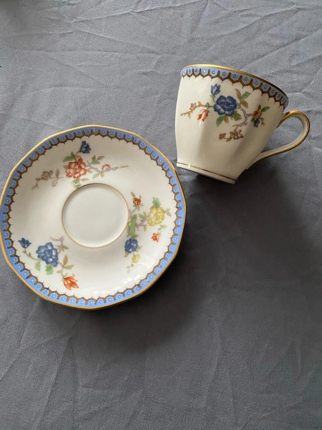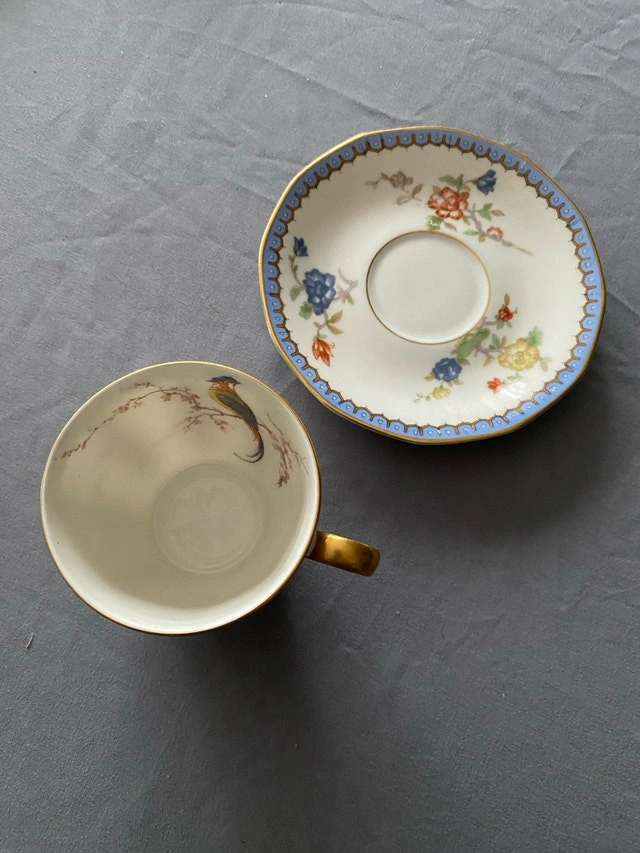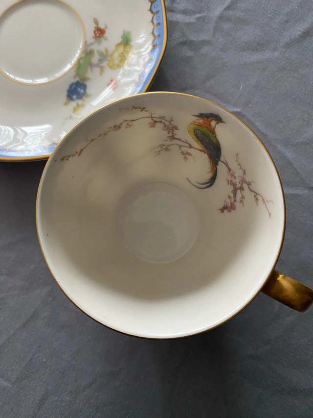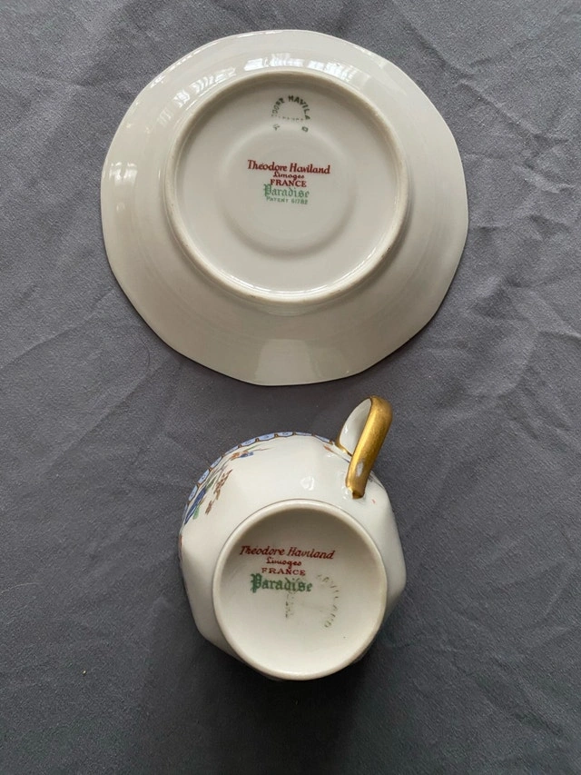 This is a used Theodore Haviland Paradise France tea cup and saucer set, showcasing a beautiful bird and floral design with gold trim. The set is in good condition, perfect for collectors or anyone who appreciates vintage fine china. It's a charming addition to any tea time.