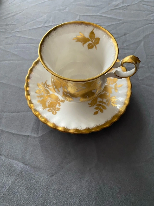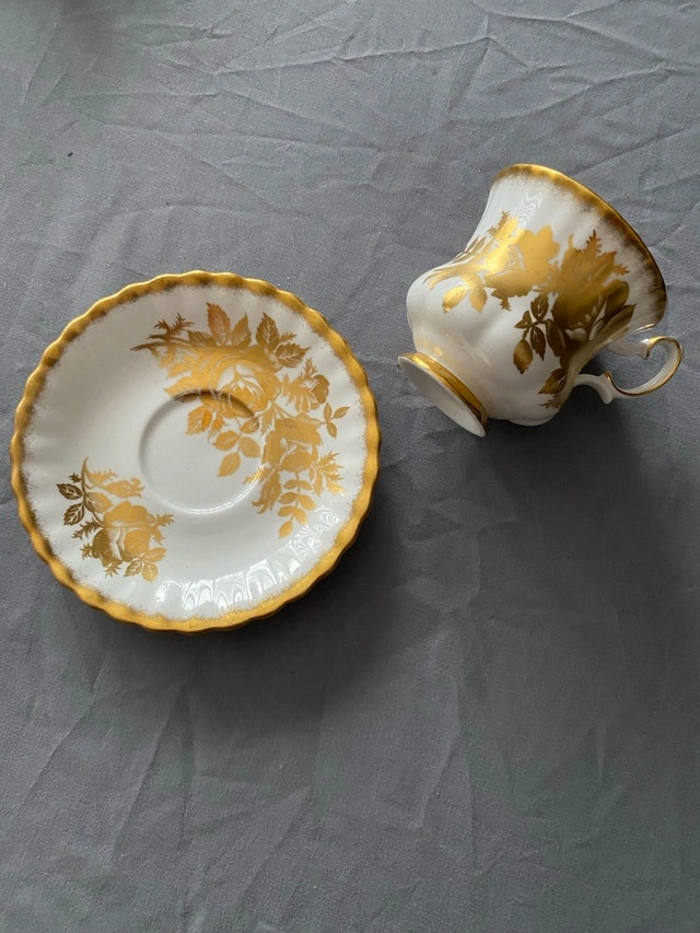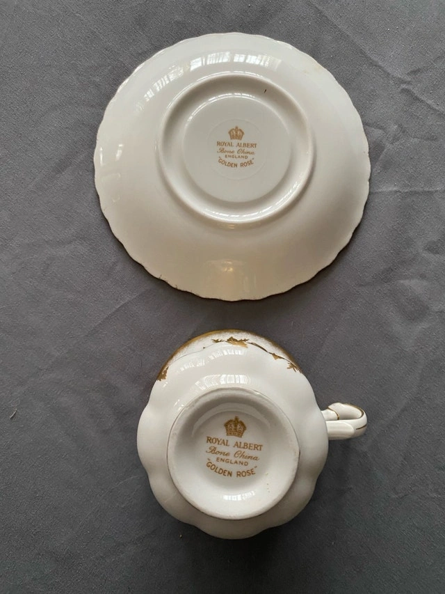 Add a touch of elegance to your tea time with this exquisite Royal Albert Bone China teacup and saucer in the Golden Rose pattern! The set is in good condition, showcasing a beautiful gold rose design on a white background. Please note that it is a used item, which only adds to its vintage charm.