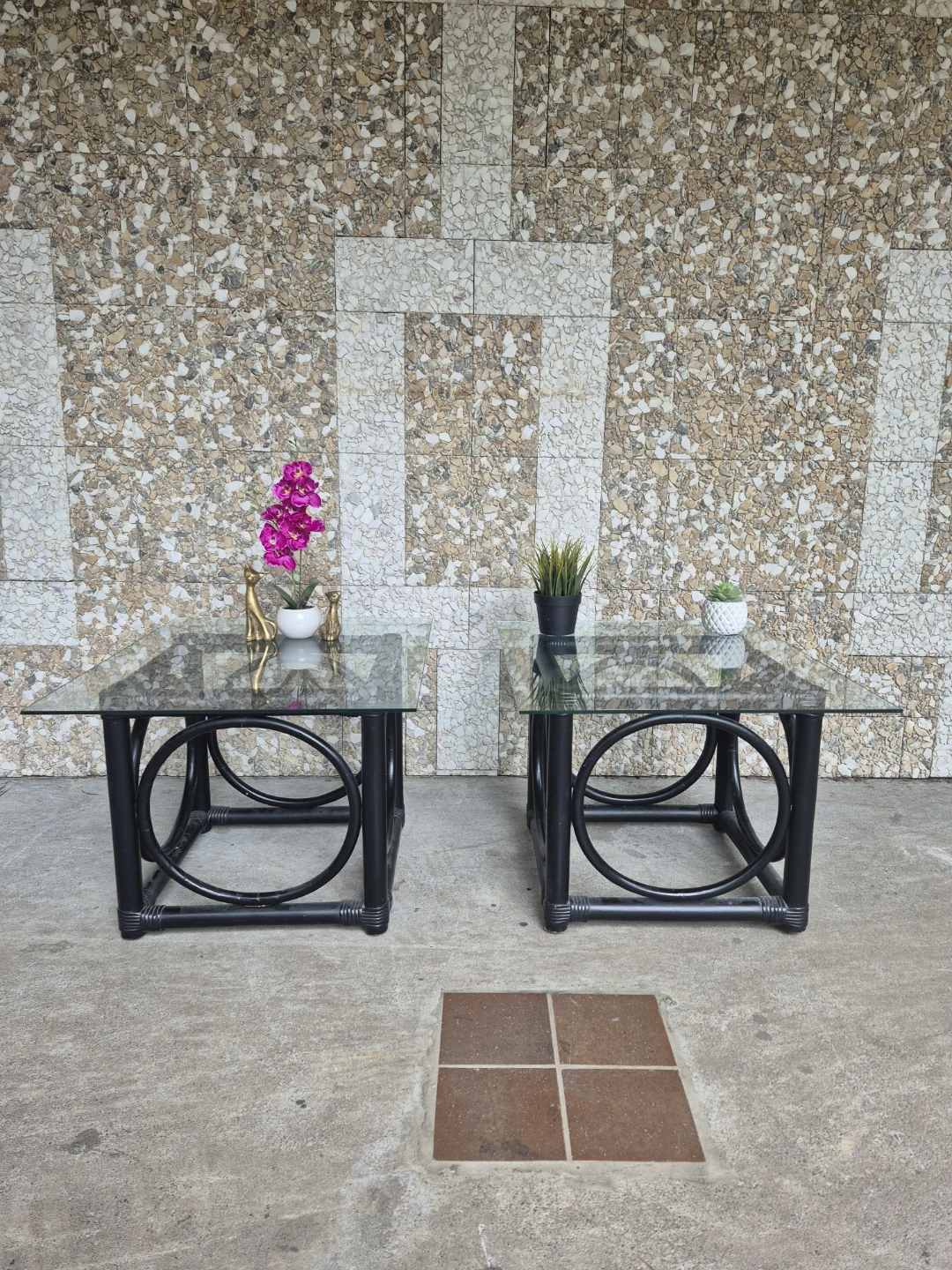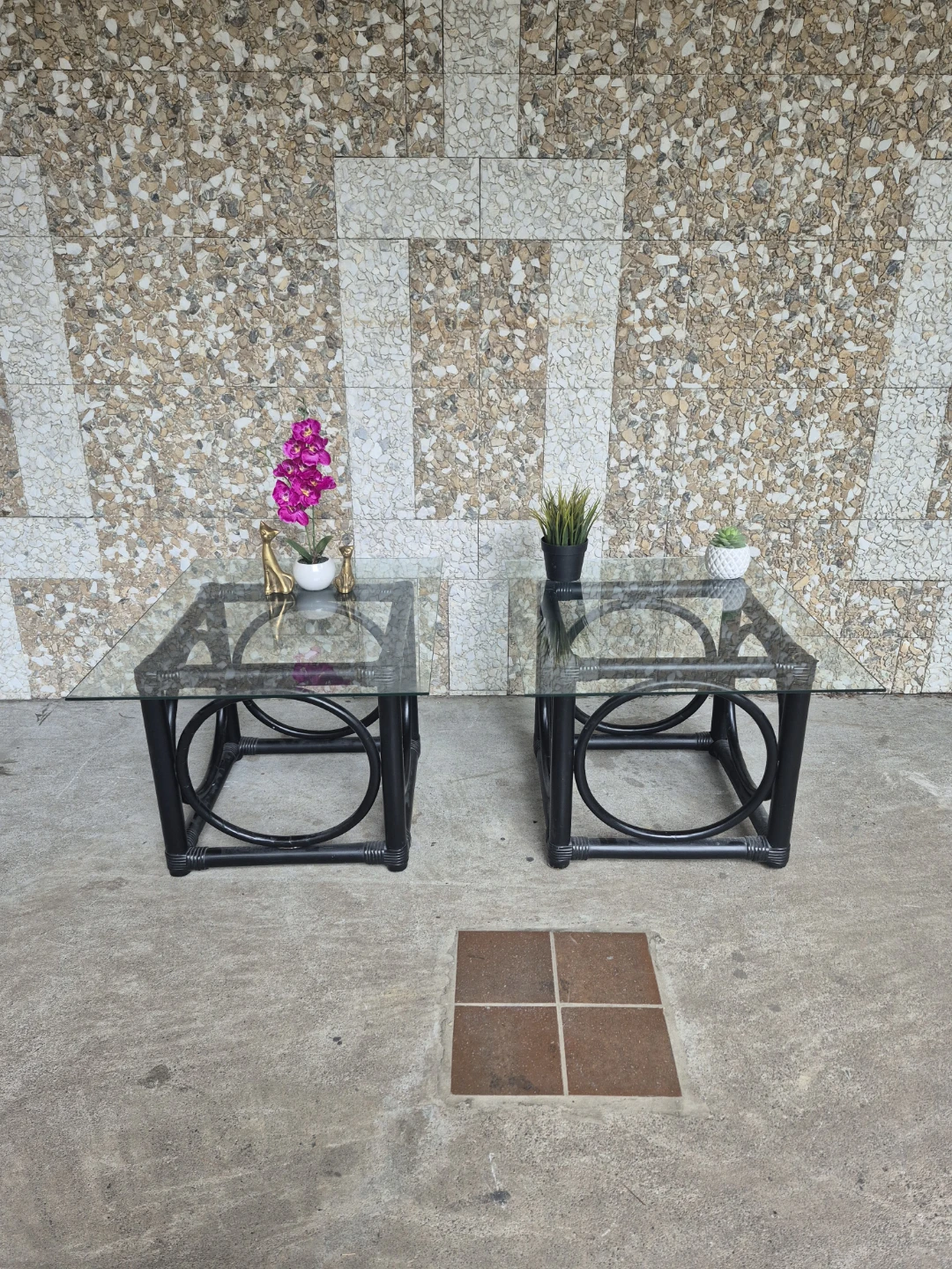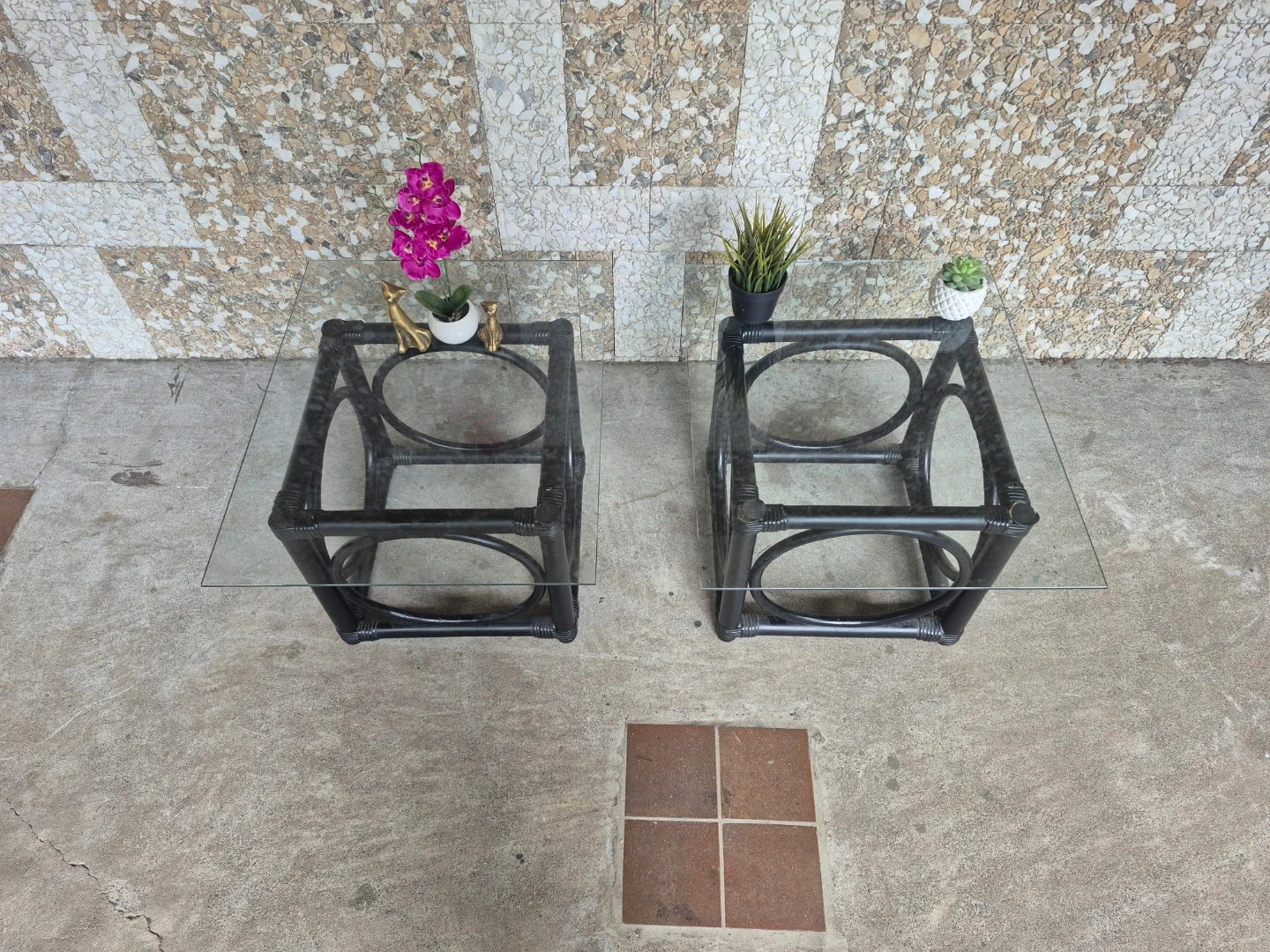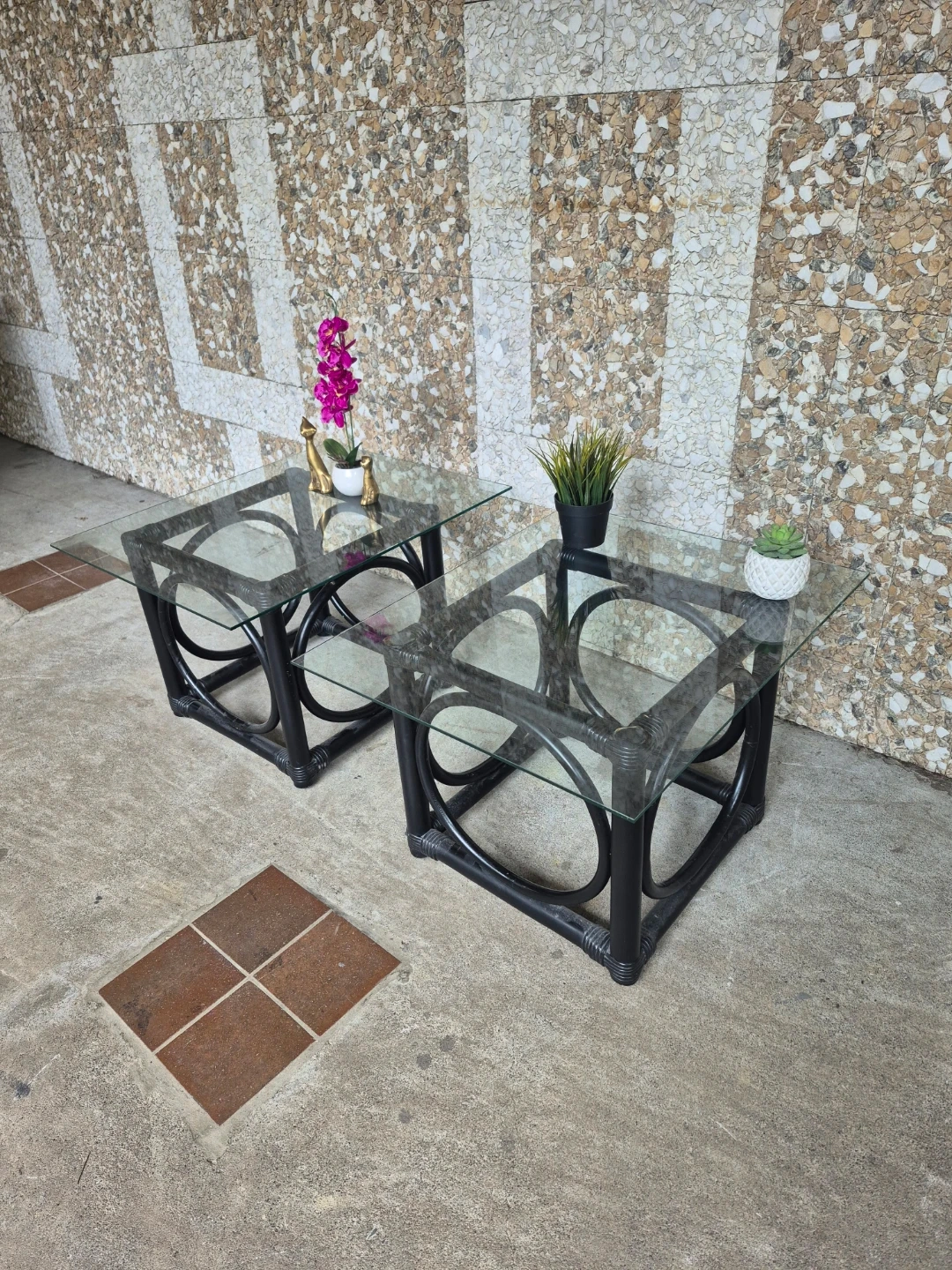 Black Rattan Glass-Top Side Tables