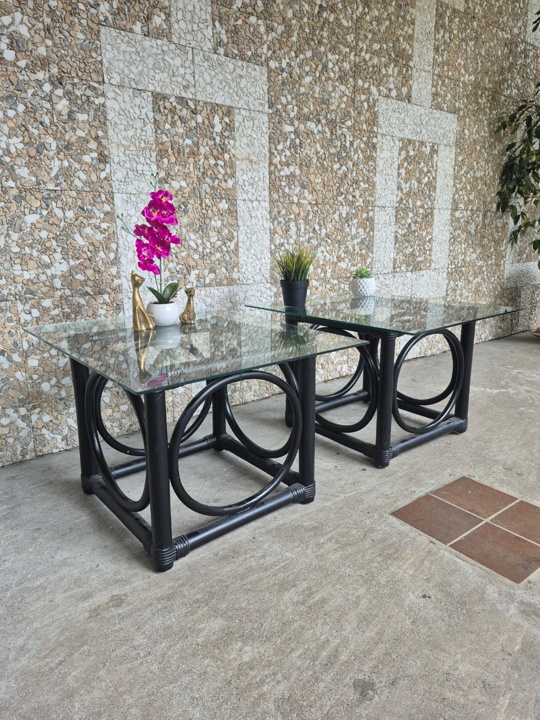 Gorgeous 1980s/90s vintage black rattan end tables/side tables – the iconic pretzel/loop design that everyone loves right now. One for 65 or both for 120