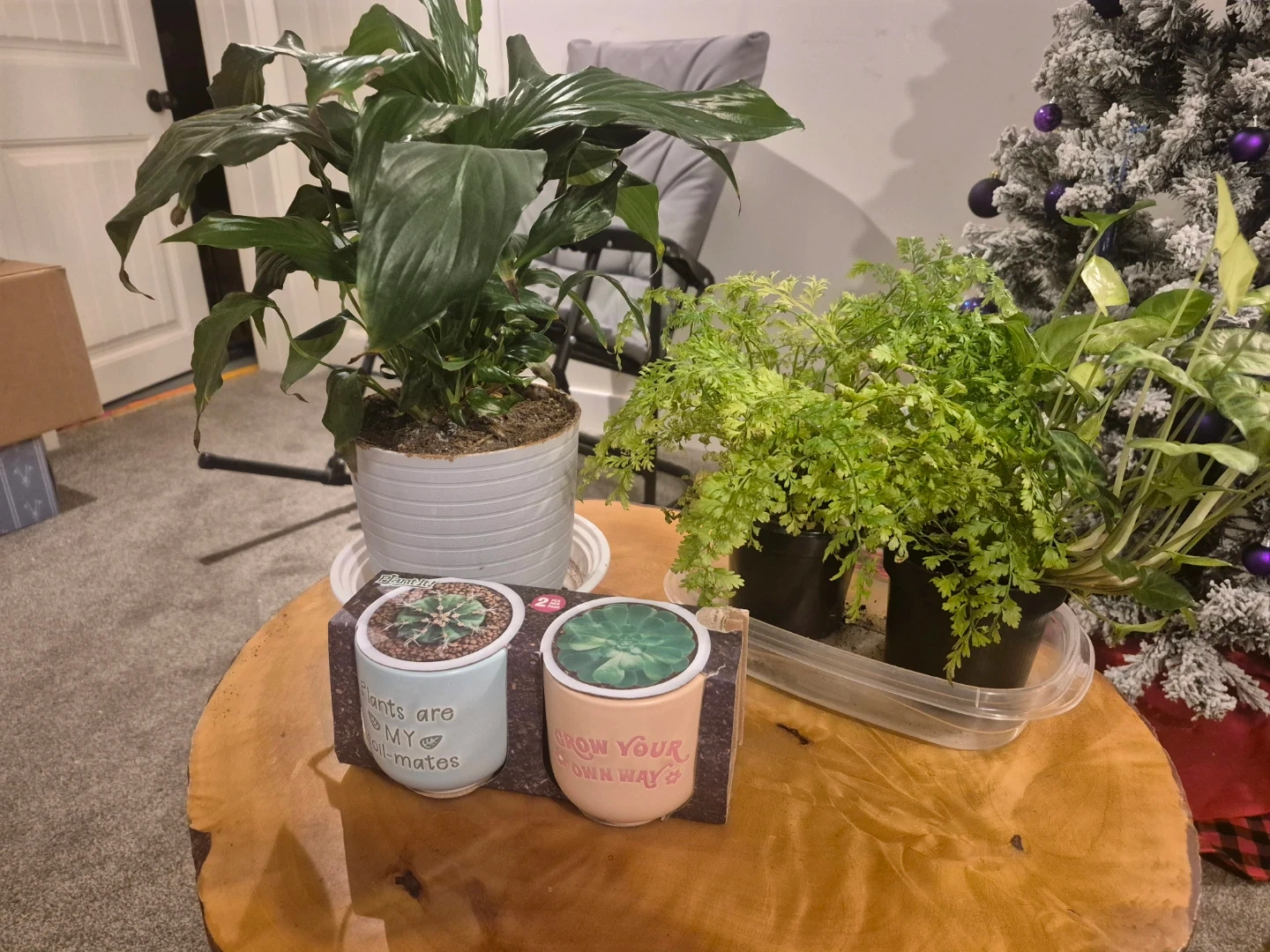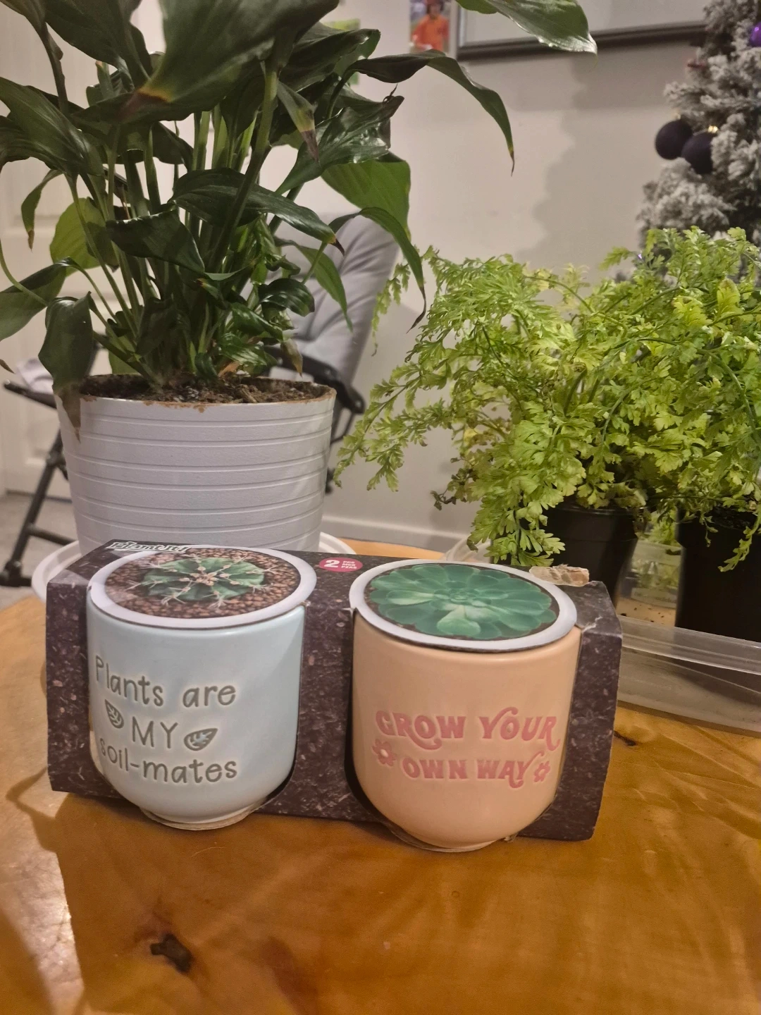 Selling a cute set of two self-watering planters, still new in the box! One planter is light blue with the text 'Plants are MY soil-mates' and the other is peach with the text 'Grow YOUR own WAY'. Perfect for small succulents or herbs!