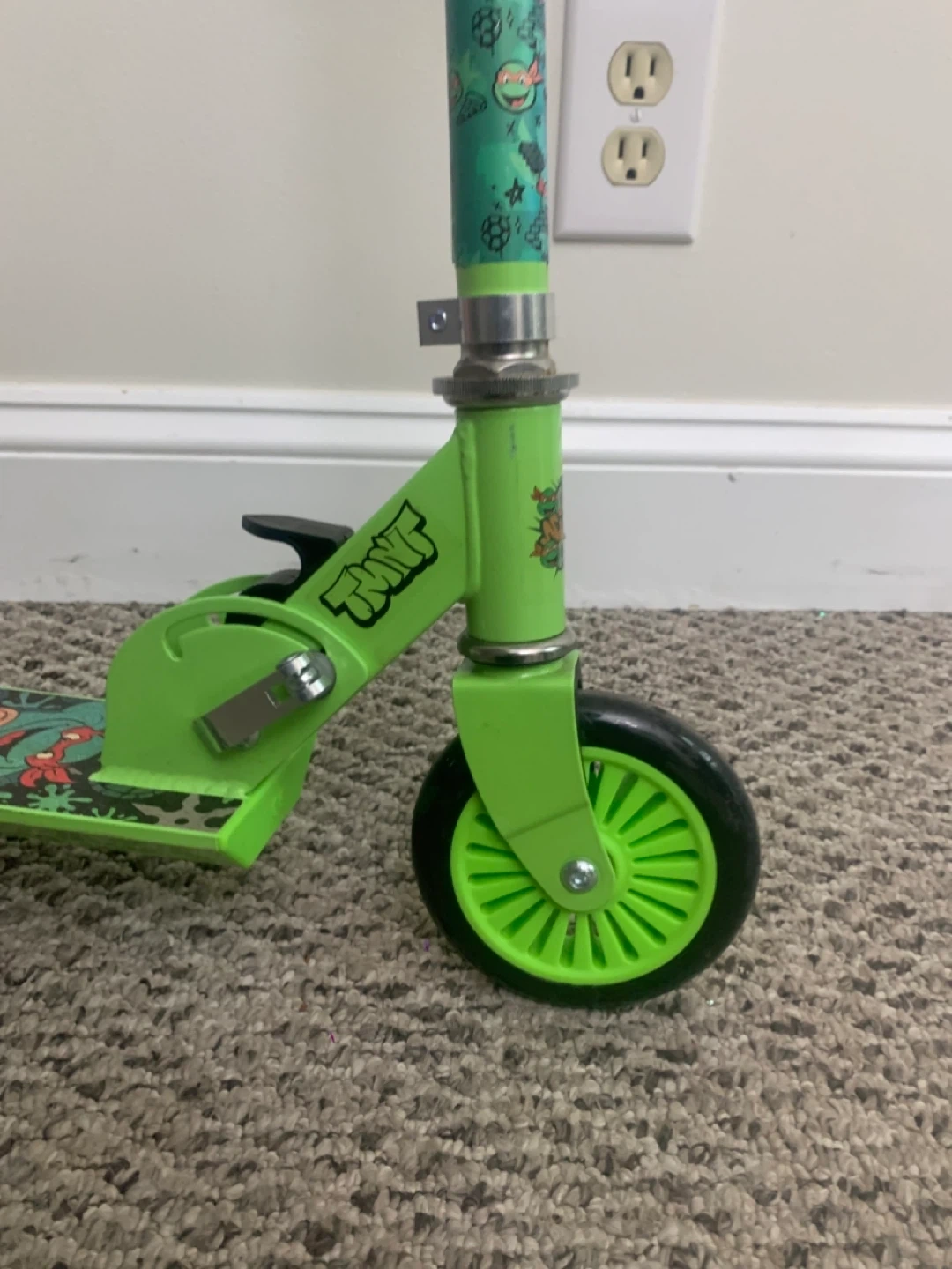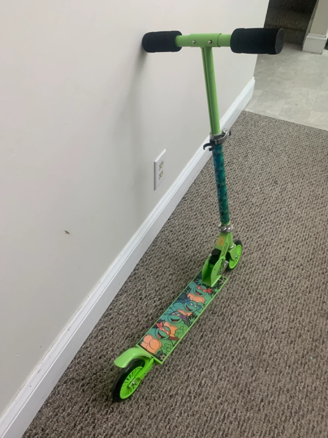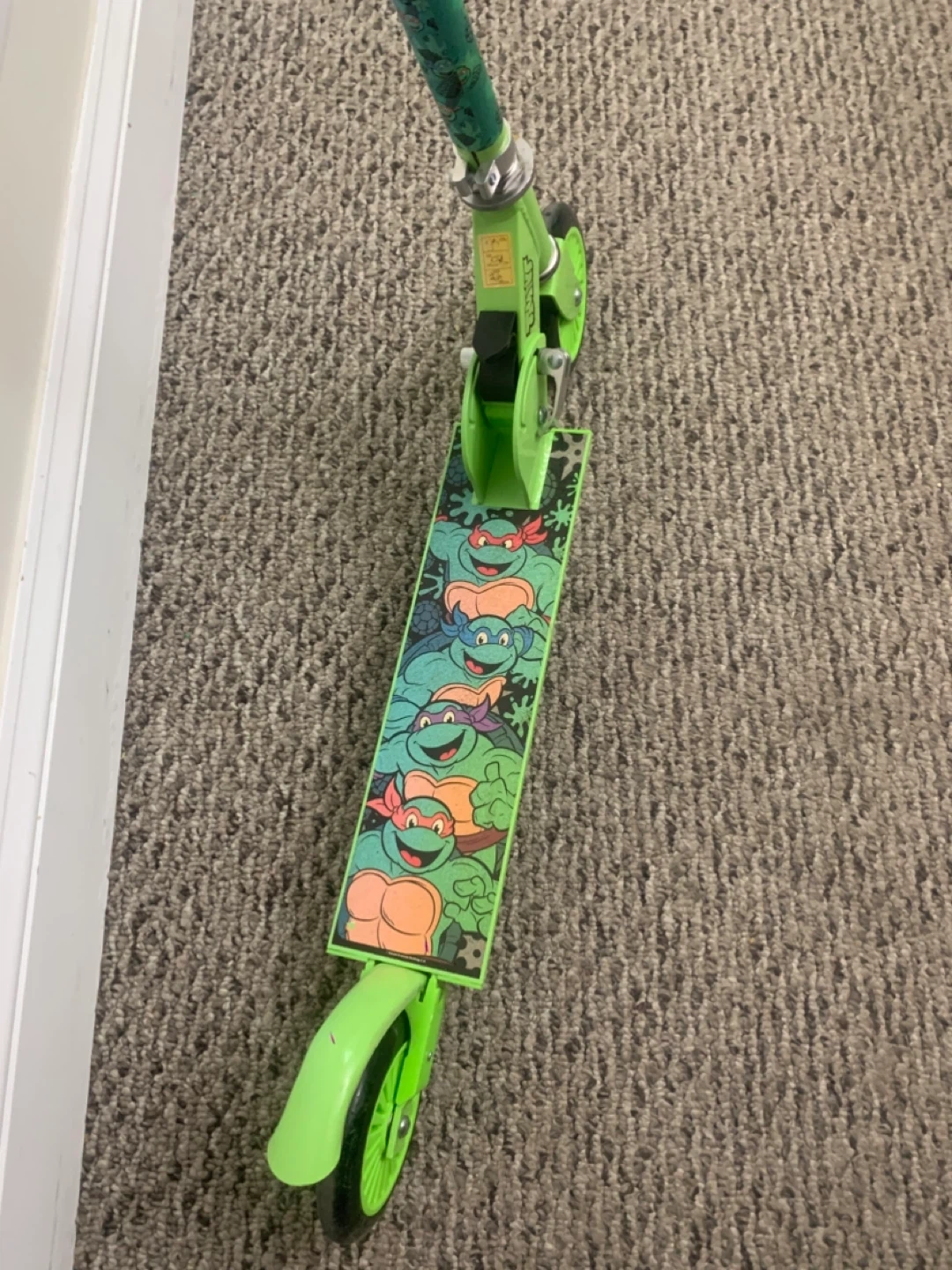 Selling a green scooter featuring the Teenage Mutant Ninja Turtles! It's in good used condition and ready for some fun rides. Perfect for kids who love TMNT and enjoy scooting around the neighbourhood