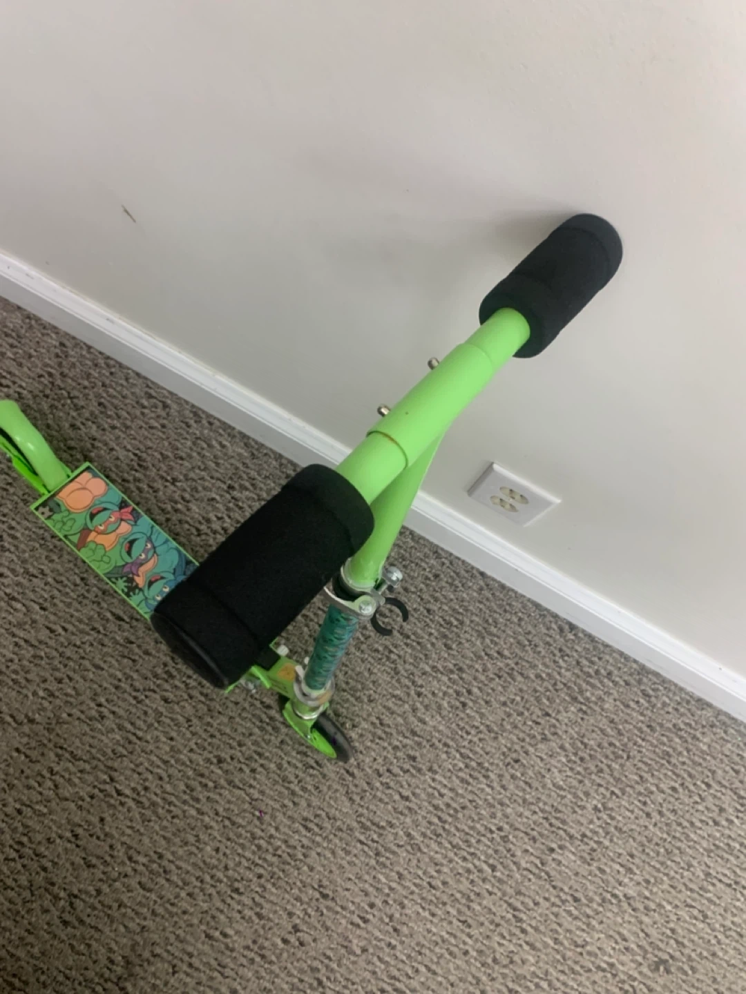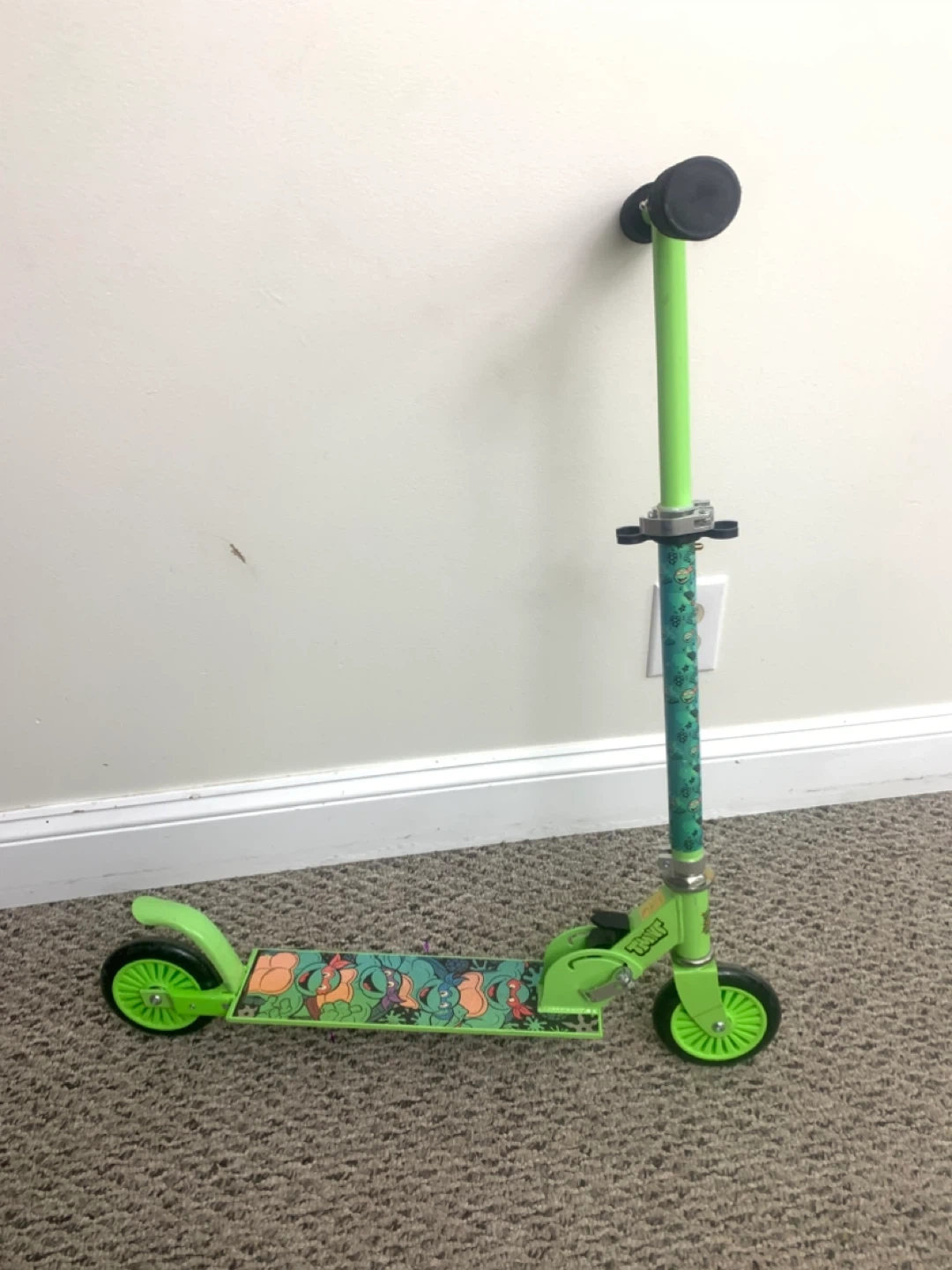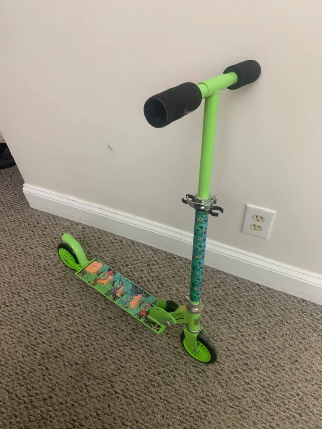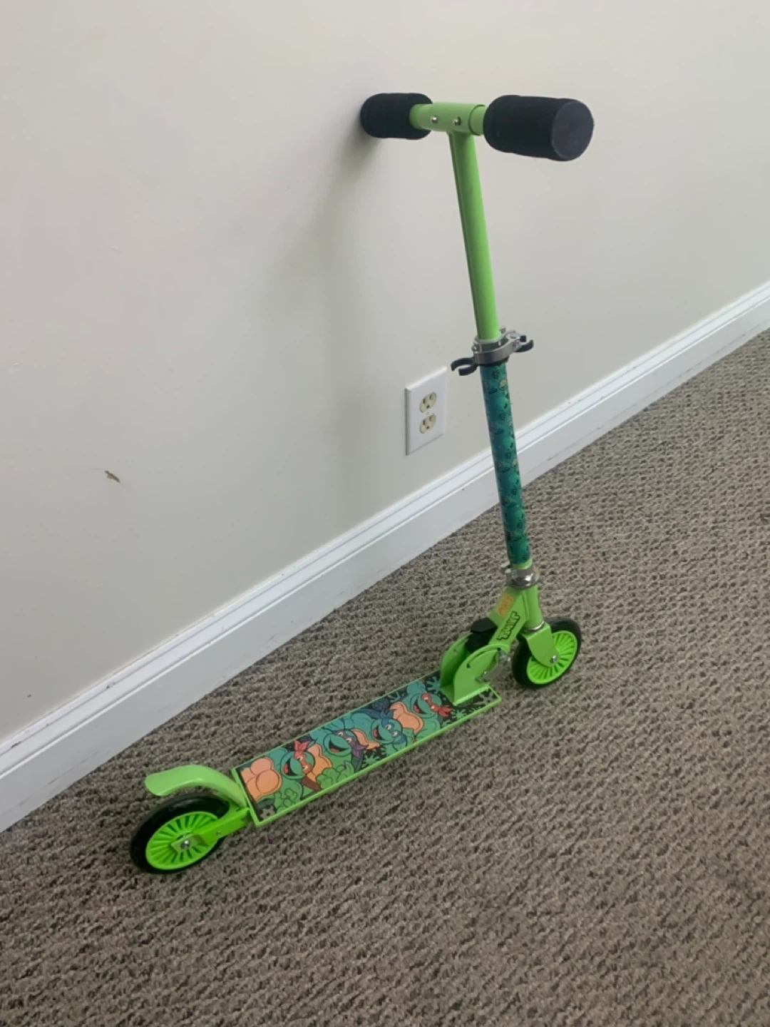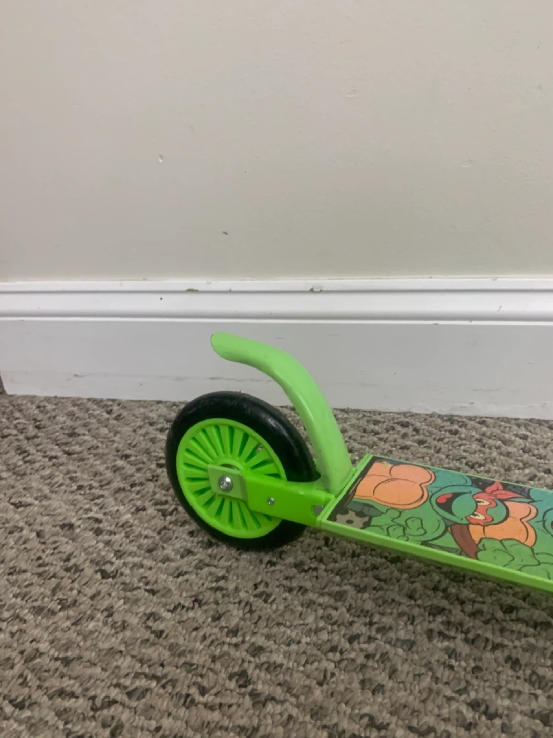Selling a green scooter featuring the Teenage Mutant Ninja Turtles! It's in good used condition and ready for some fun rides. Perfect for kids who love TMNT and enjoy scooting around the neighbourhood