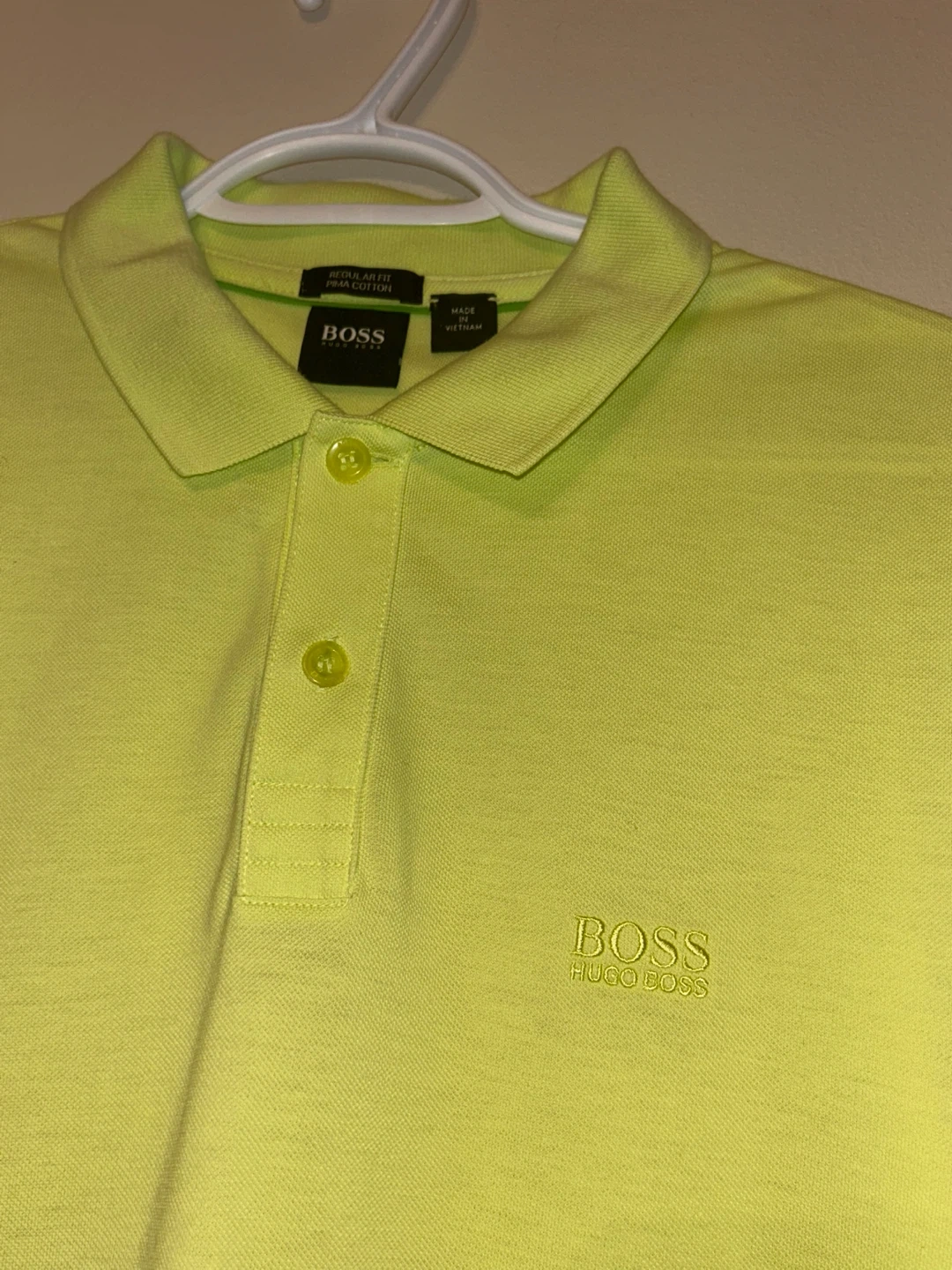 Looking to pass along this BOSS Hugo Boss polo shirt. It's a regular fit in a vibrant green colour. Size is M. Perfect for adding a pop of colour to your wardrobe!