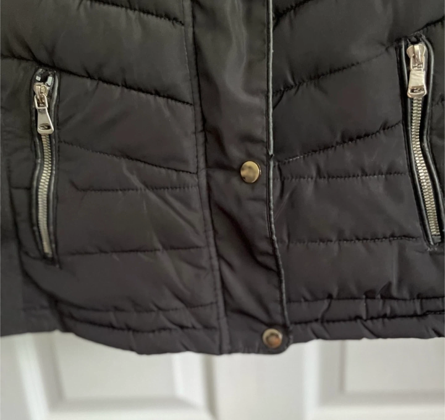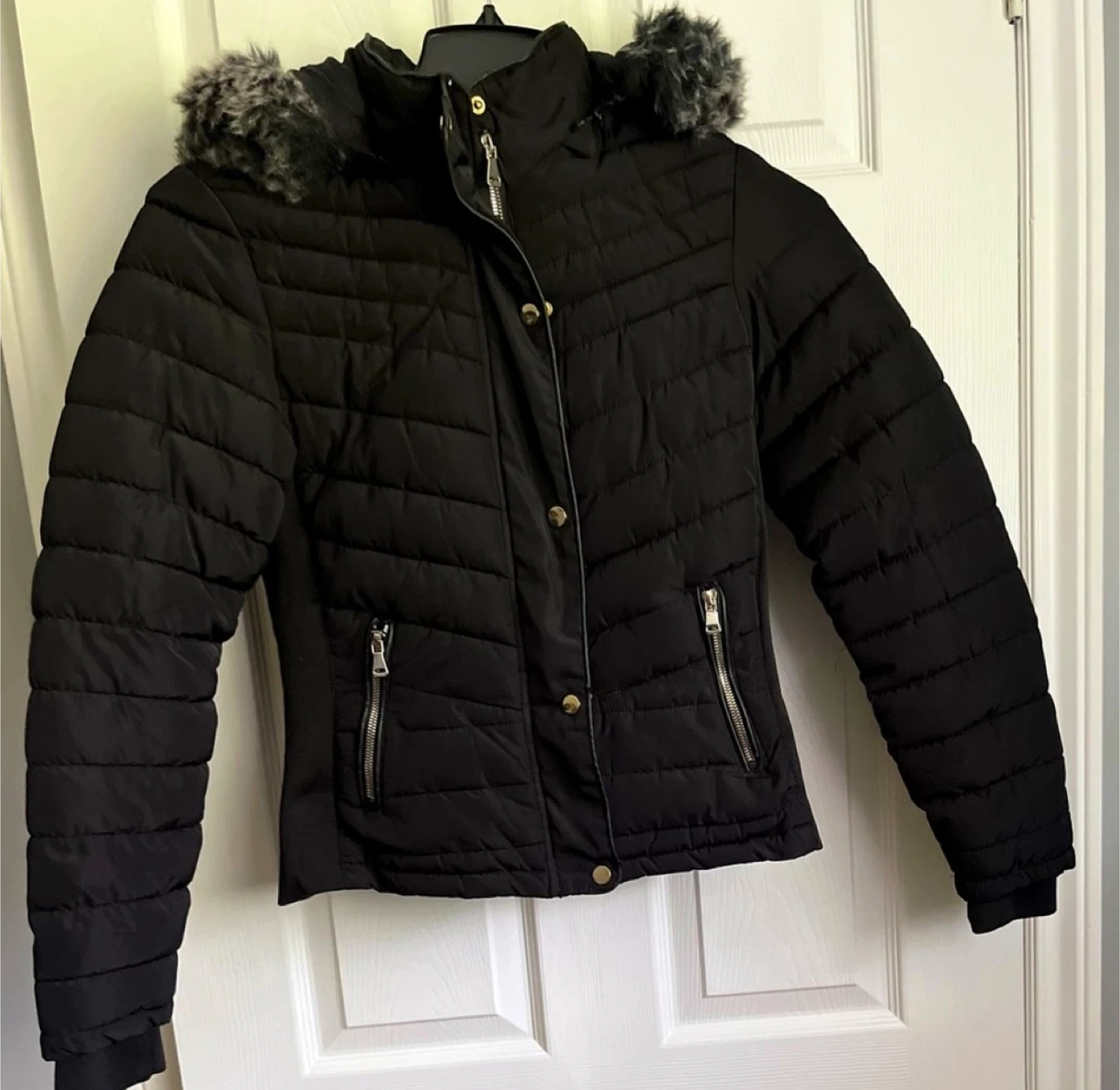 Selling a used YMI Collection puffer jacket in black. It's a size small and features a faux fur hood trim and a quilted design. Perfect for staying warm and stylish during the colder months! It has some signs of wear still in good condition.
