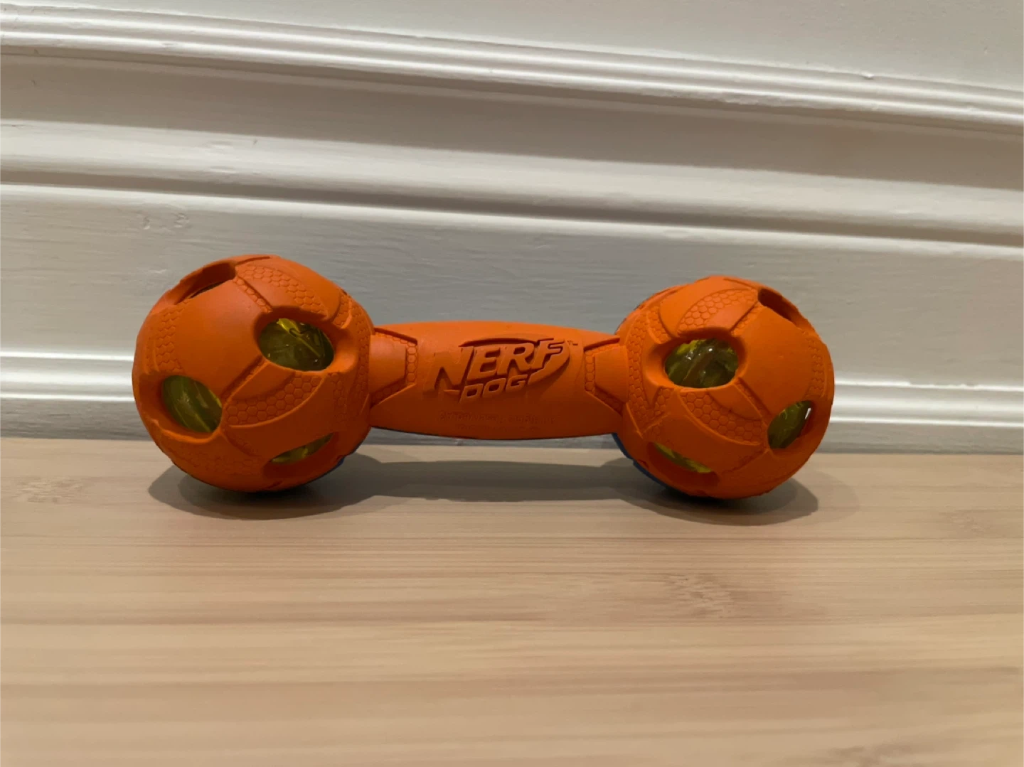 Here's an orange Nerf Dog football dumbbell! It's designed for interactive play and is sure to keep your furry friend entertained, it no longer lights up as much but still great for chewing and fetching
