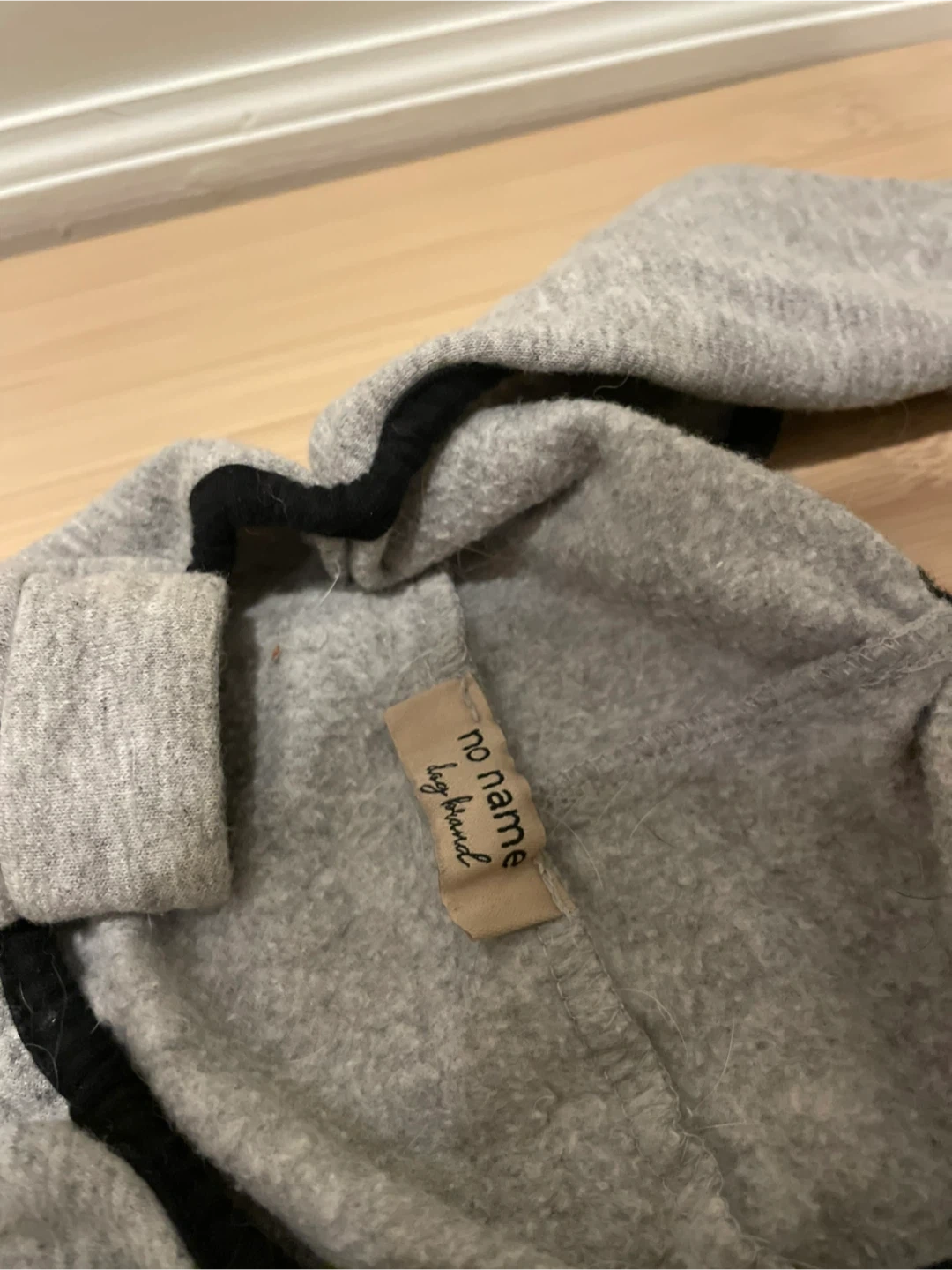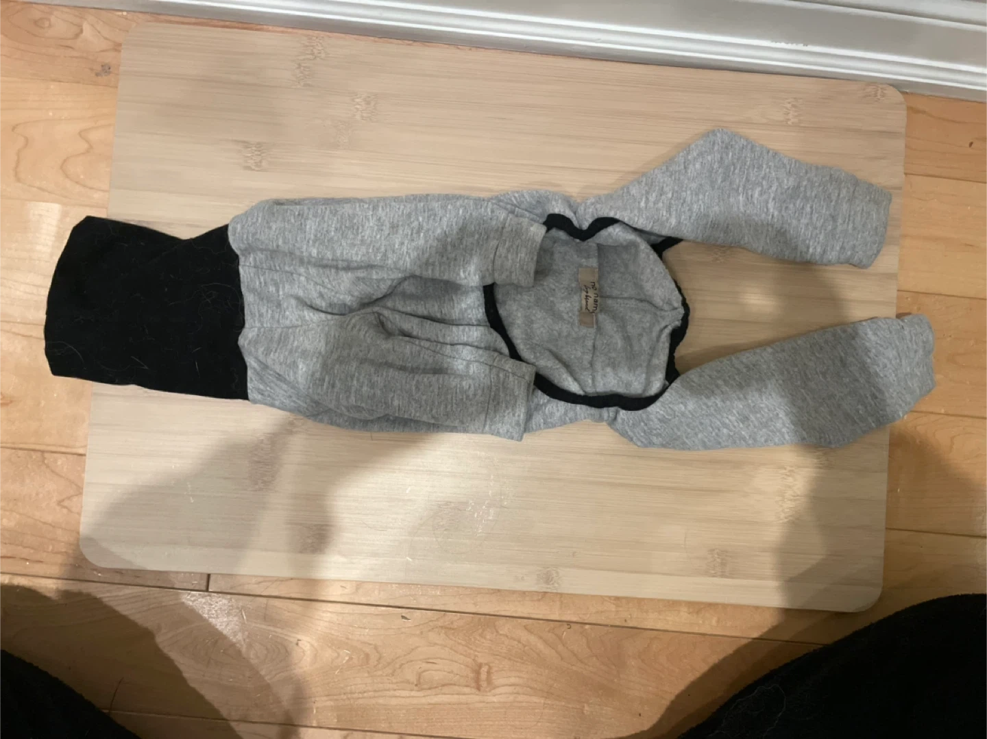 These dog pajamas are in good condition and ready to keep your furry friend warm! They feature a grey body with black trim. The tag says "no name by hindal". Size small