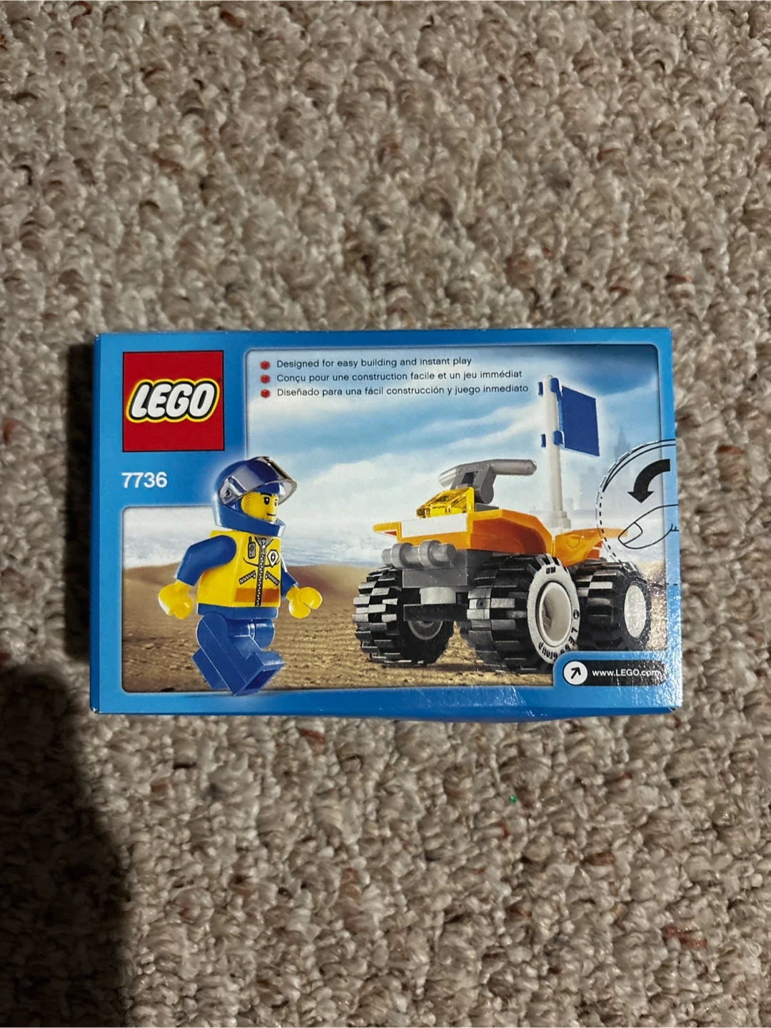 Selling a LEGO City Coast Guard Quad Bike, model number 7736. This set is suitable for ages 5-12 and includes 33 pieces to build a quad bike. It's designed for easy and instant play!