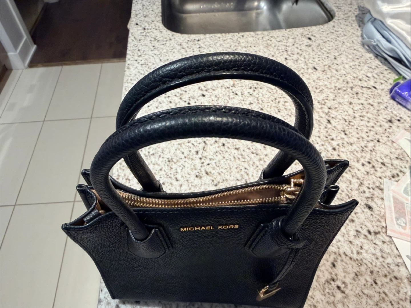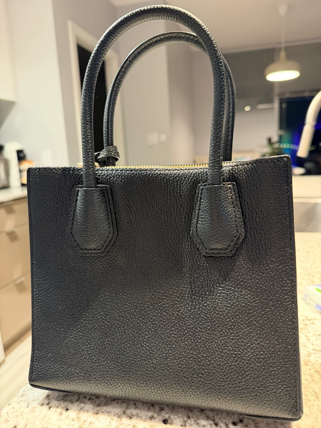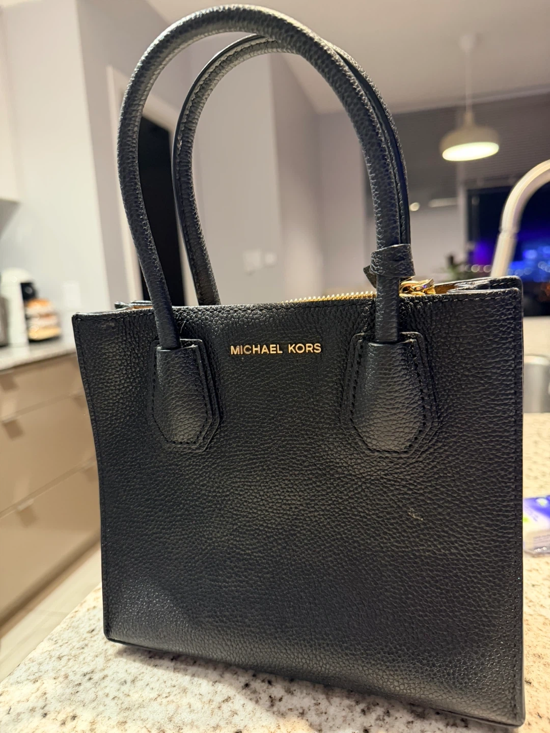 Selling a Michael Kors black leather tote bag. It's in great condition and perfect for everyday use! The bag features a gold zipper and the iconic Michael Kors logo. It's a stylish and practical accessory to add to your collection