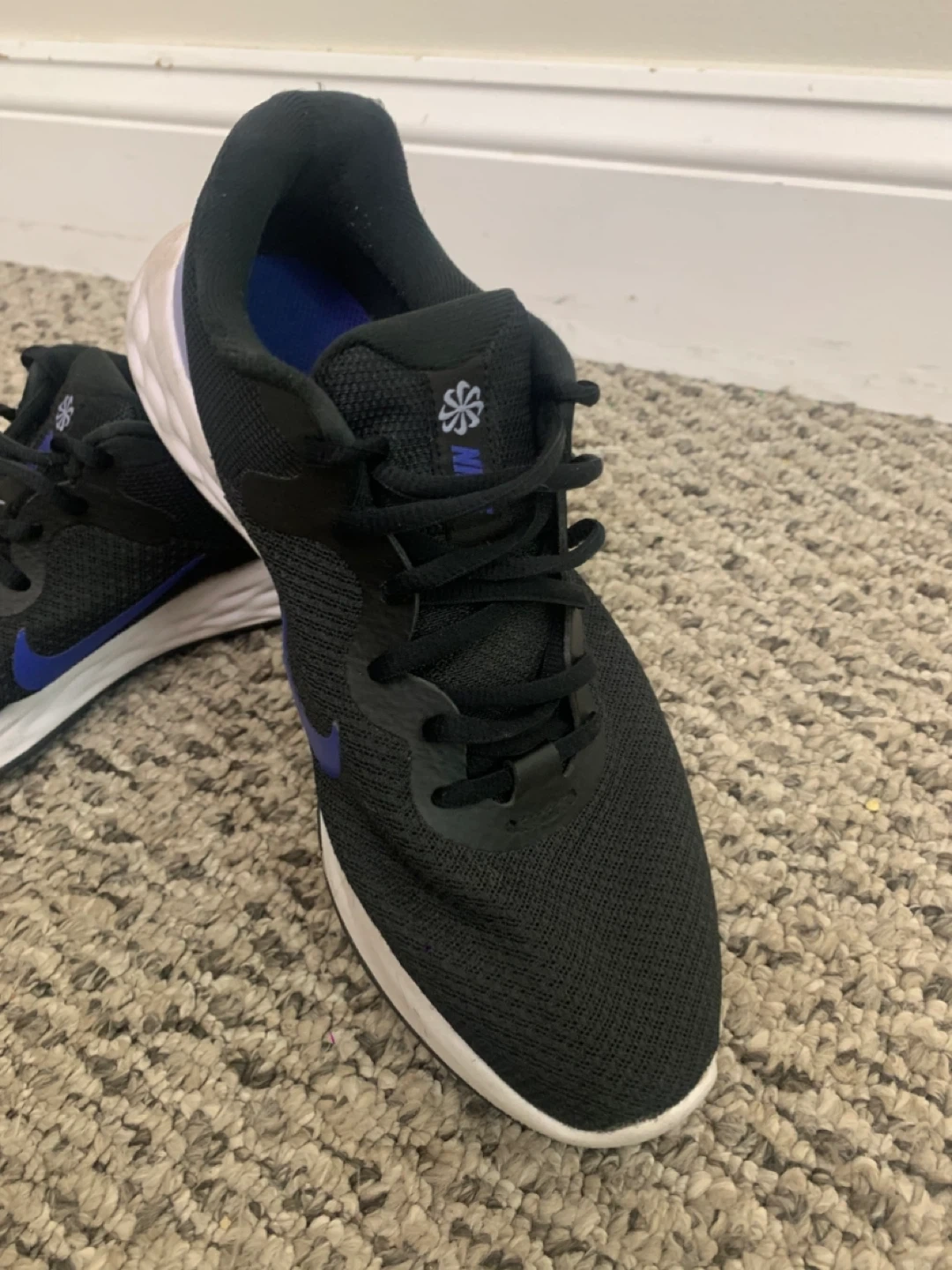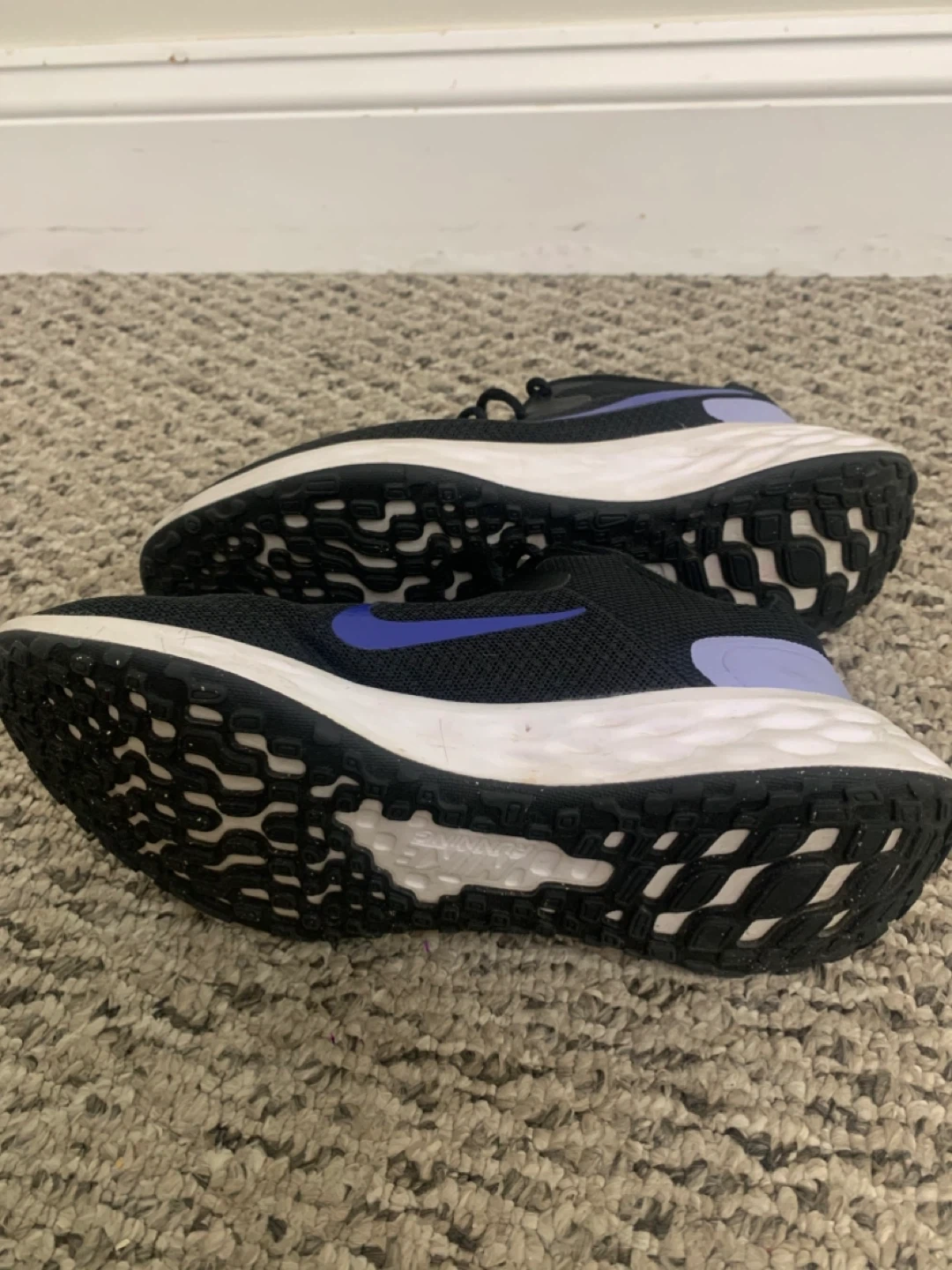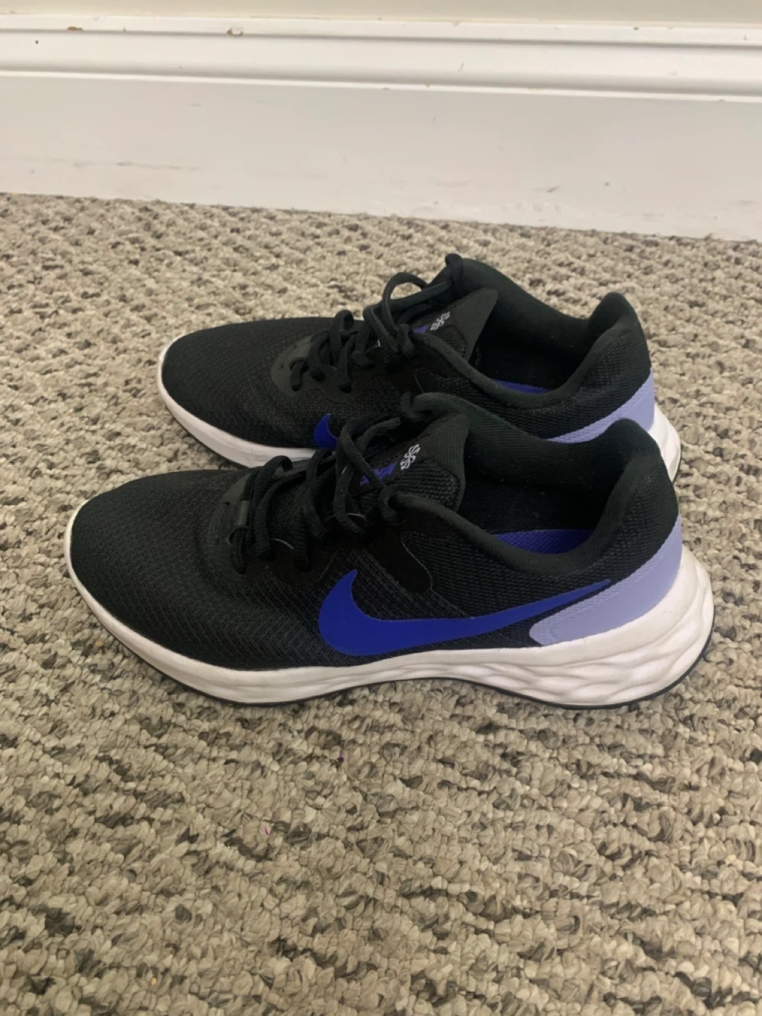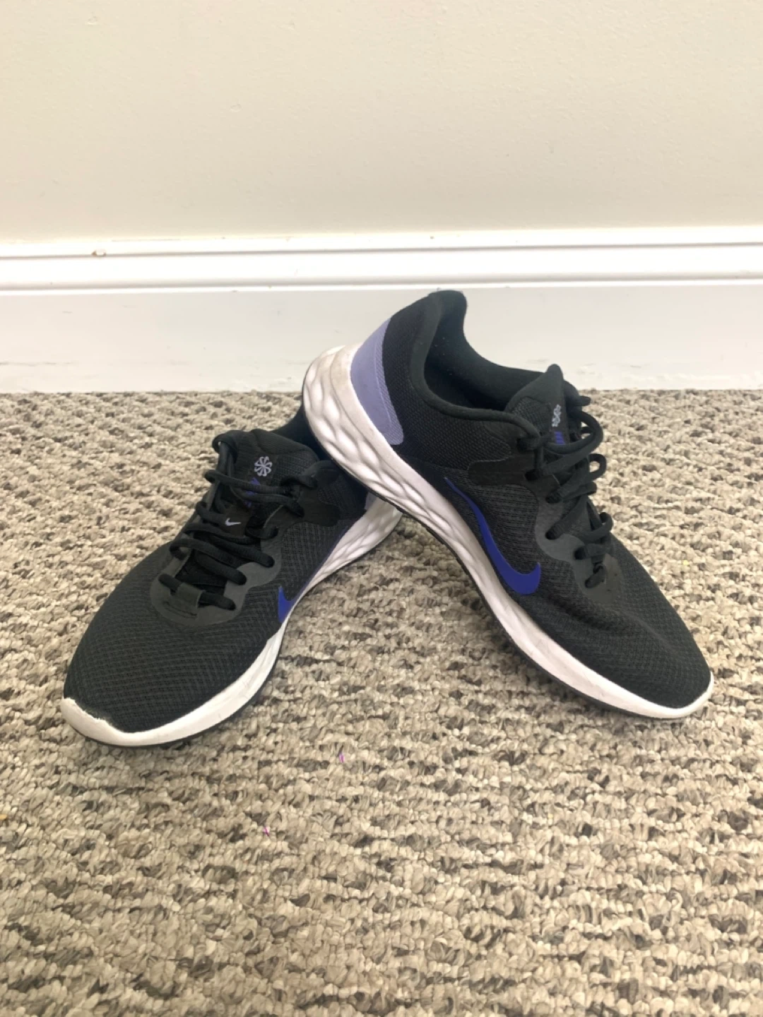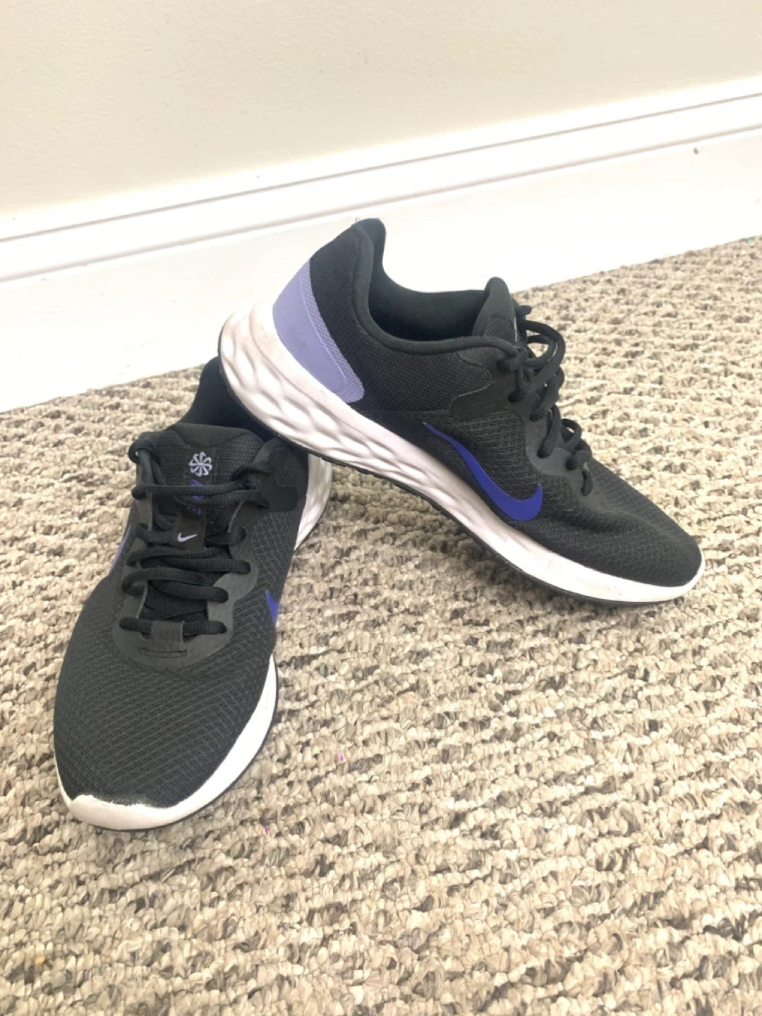 Selling a pair of Nike Revolution 6 running shoes in black with purple accents. They're in great shape and ready for a new home!