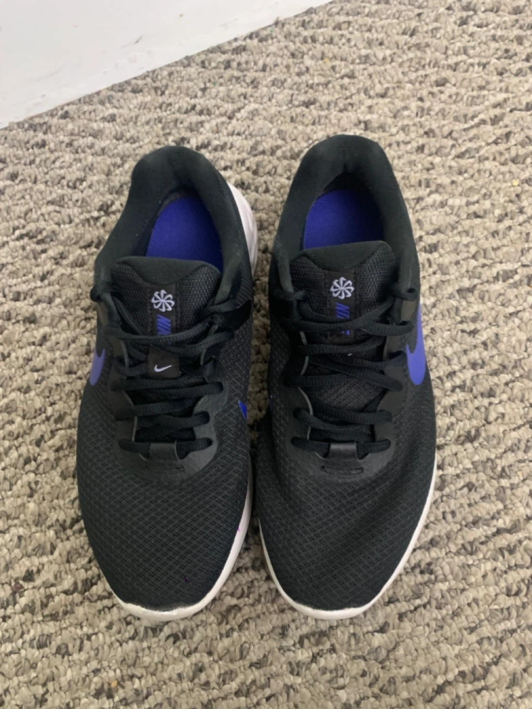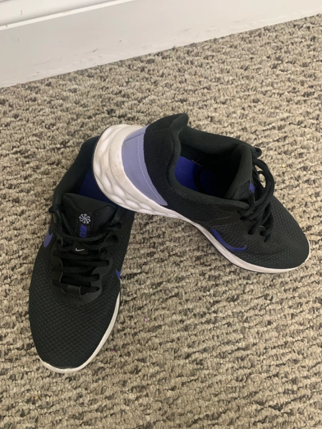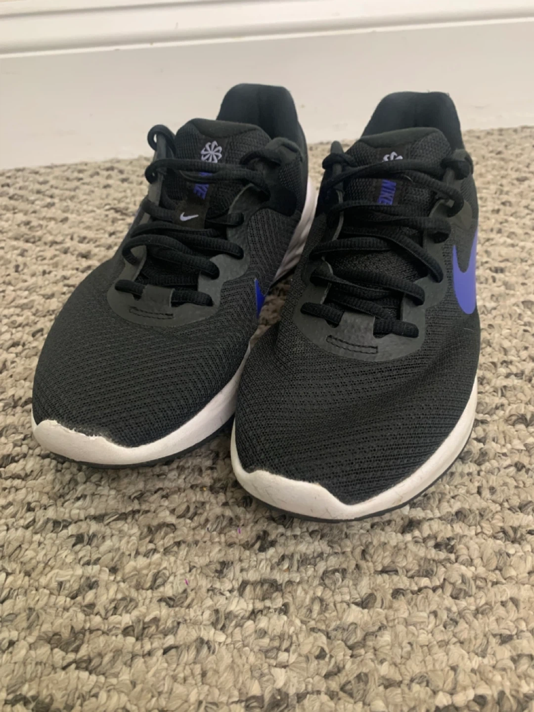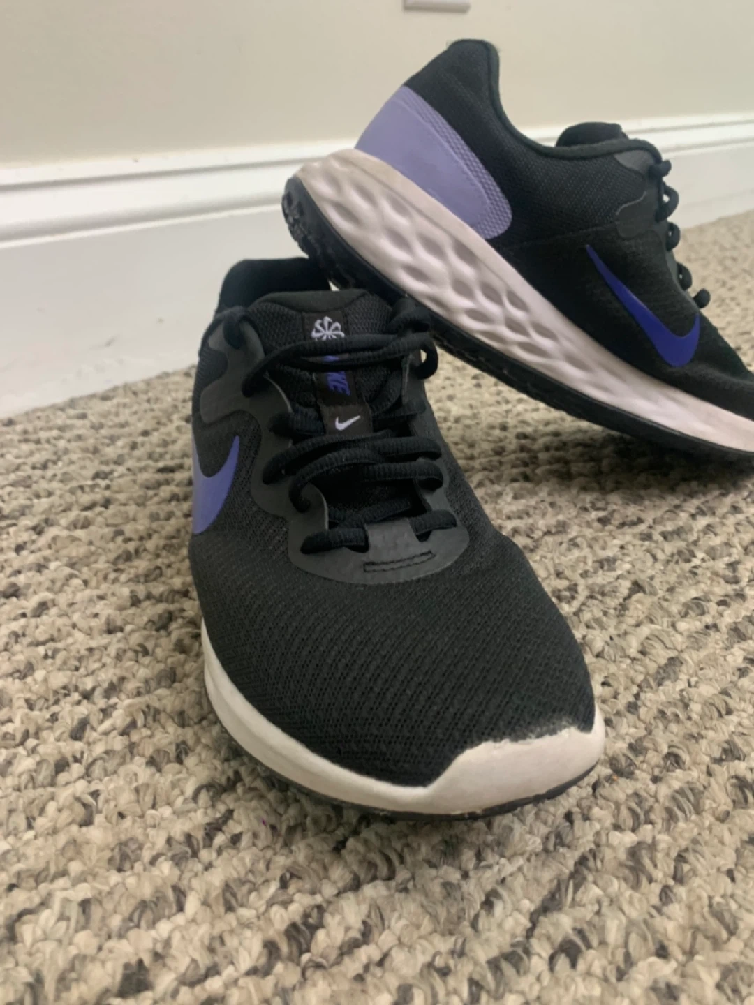 Selling a pair of Nike Revolution 6 running shoes in black with purple accents. They're in great shape and ready for a new home!