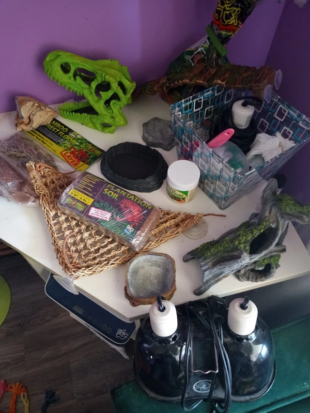 Zoom in on picture with accessories to really see everything you get . Lots of soils , lamps , calcium , gardening tools, and two 10 gallon tanks, one 18 gallon tank , and a starter tank for babies . Everything in photos for only $200!!!! All in working goood condition . Everything you need to get your amphibians set up!