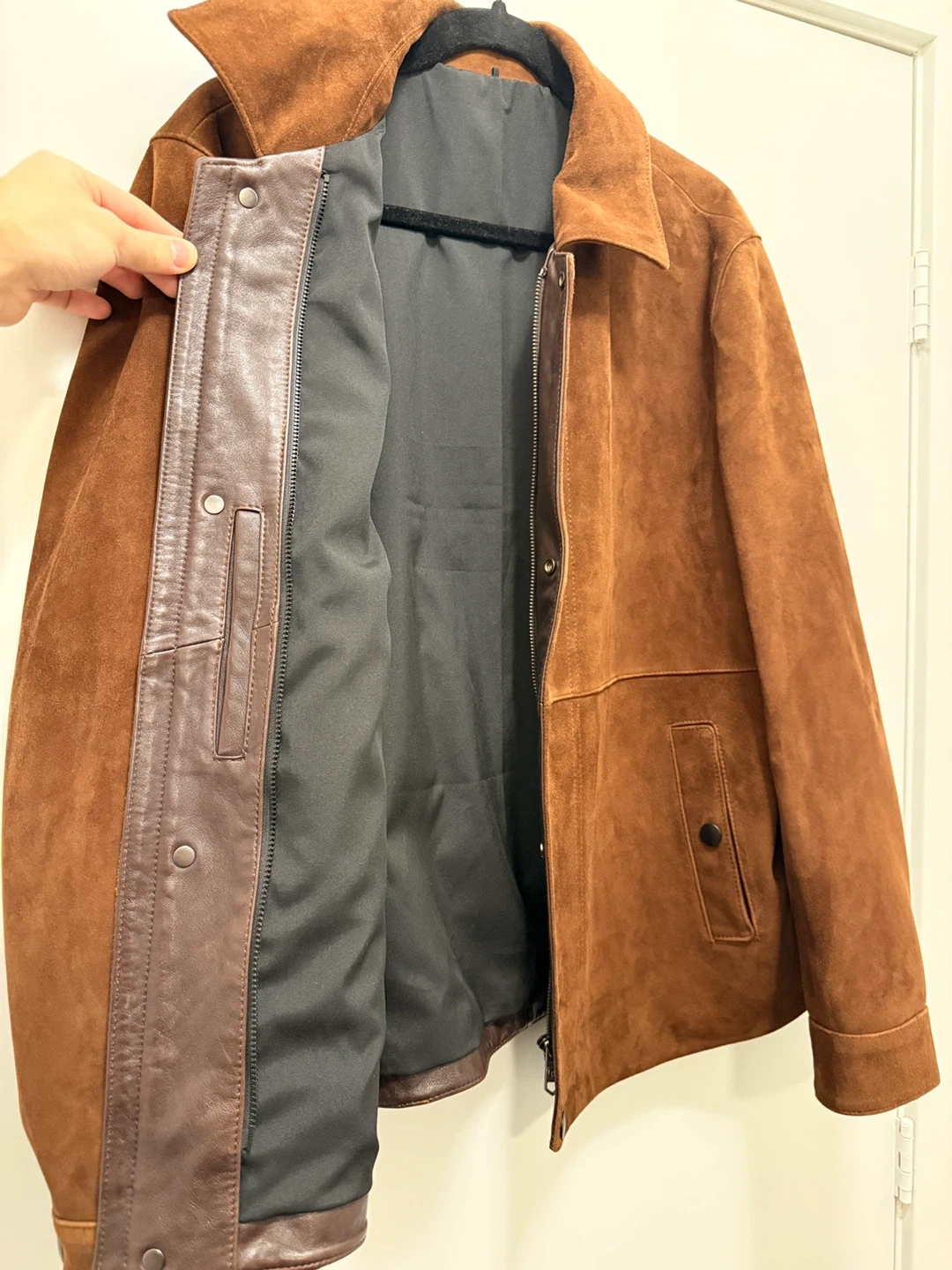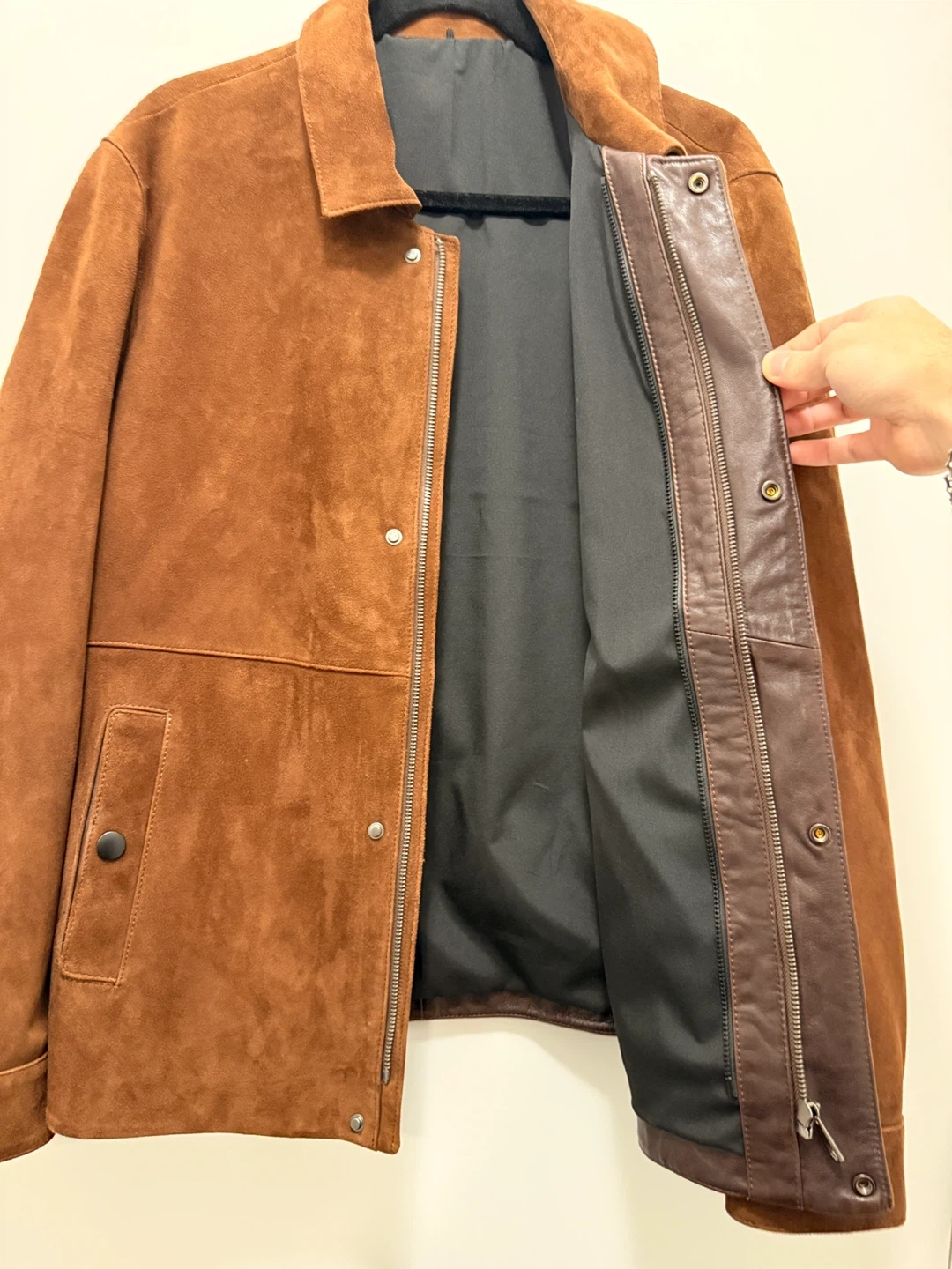 High-quality brown suede jacket in excellent condition. Soft genuine suede exterior with a clean, structured fit. Inner lining is smooth and comfortable, with snap buttons and a hidden zipper closure for a refined look. No stains, scratches, or wear on the suede.