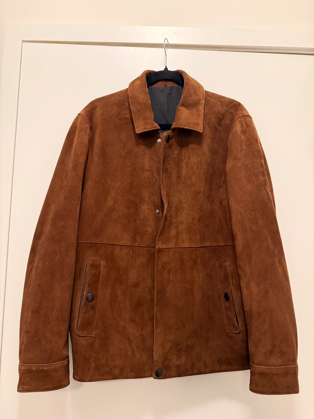 High-quality brown suede jacket in excellent condition. Soft genuine suede exterior with a clean, structured fit. Inner lining is smooth and comfortable, with snap buttons and a hidden zipper closure for a refined look. No stains, scratches, or wear on the suede.