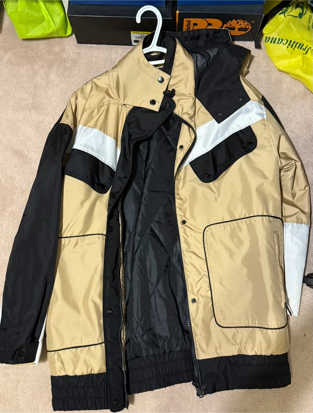 Here's a stylish colour block padded jacket! The jacket features a unique design with beige, black, and white colour blocking. Perfect for staying warm and fashionable during cooler weather