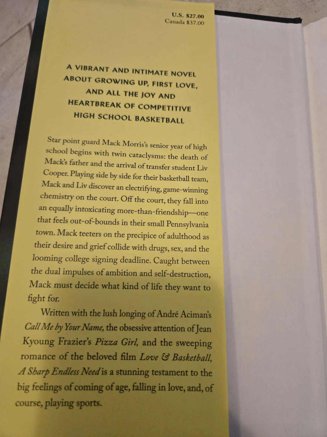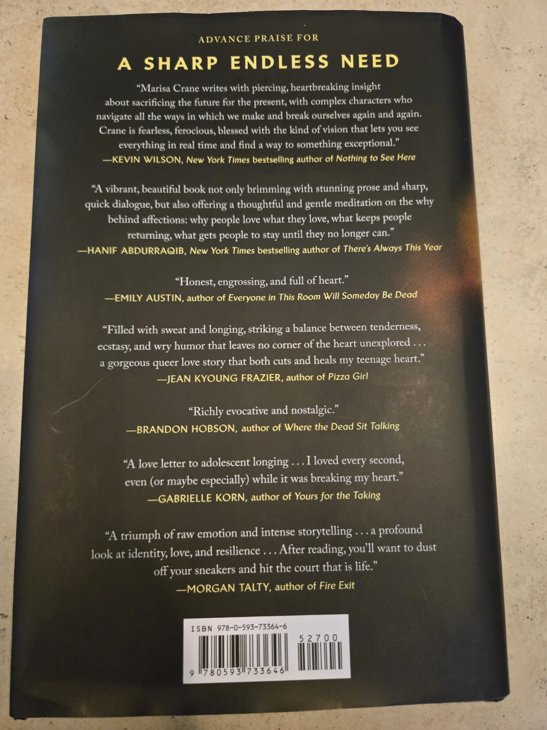 selling or trading the hardcover novel 'A Sharp Endless Need' by Marisa Crane. According to the AI Karrot ad writer it's a vibrant and intimate novel about growing up, first love, and the joy and heartbreak of competitive high school basketball. The story follows Mack Morris, a senior, as they navigates love, loss, and self-discovery. #queerbooks