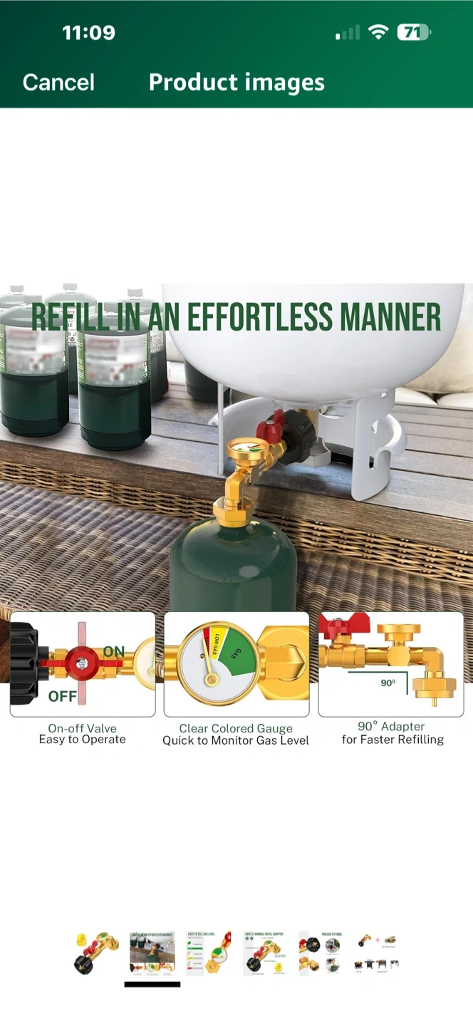 This propane refill adapter makes refilling easy! It features an on-off valve that is easy to operate, a clear coloured gauge to quickly monitor the gas level, and a 90° adapter for faster refilling
