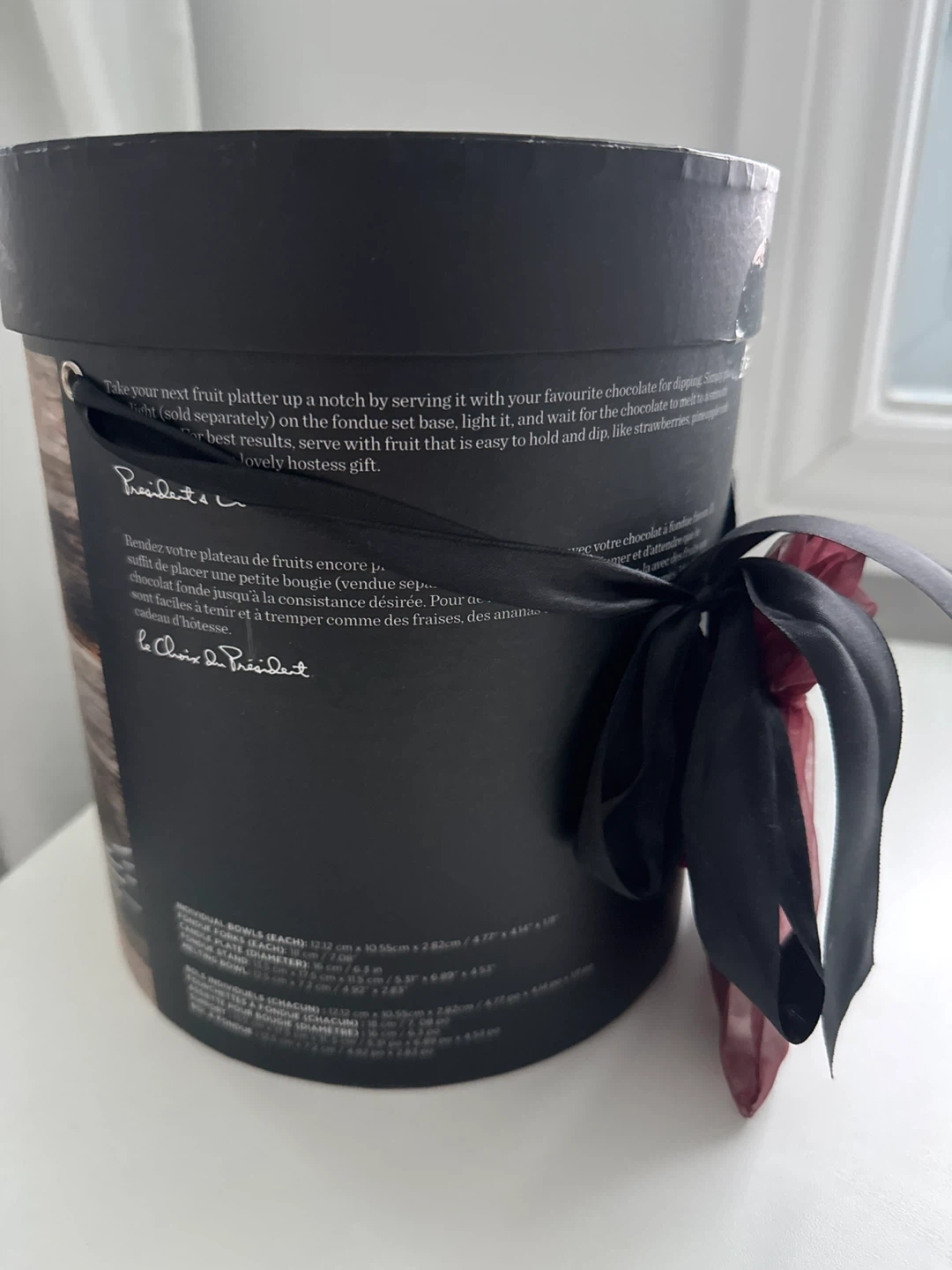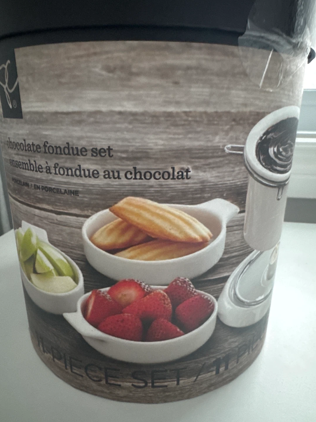 Selling a President's Choice chocolate fondue set! This 11-piece set is perfect for a fun dessert night. It's easy to hold and dip, like strawberries or marshmallows. Would make a lovely hostess gift too!