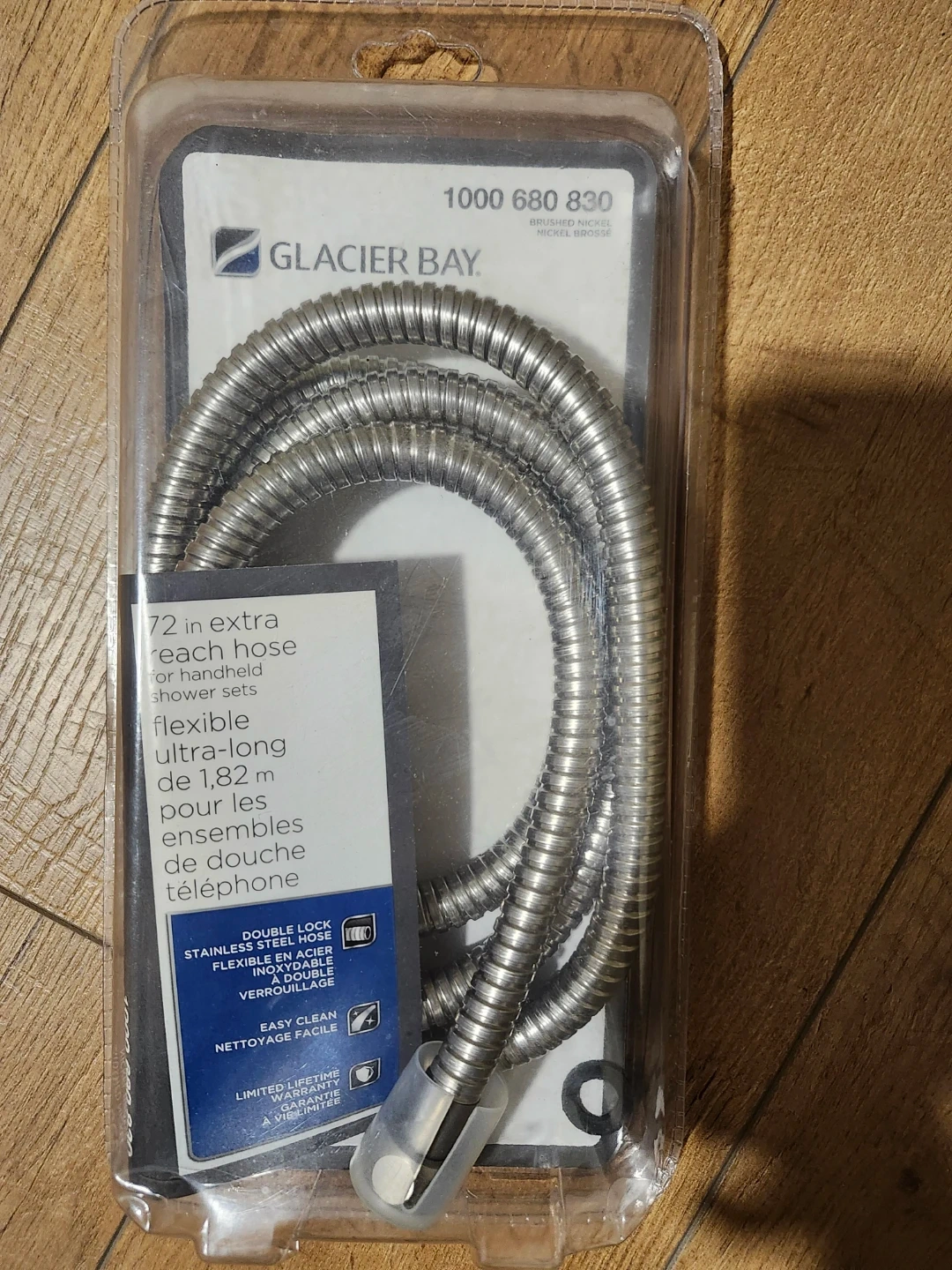 Selling a brand new Glacier Bay 72-inch extra reach hose for handheld shower sets! It's still in its original packaging. This hose is a flexible, ultra-long stainless steel hose with a double lock. It's also designed for easy cleaning!