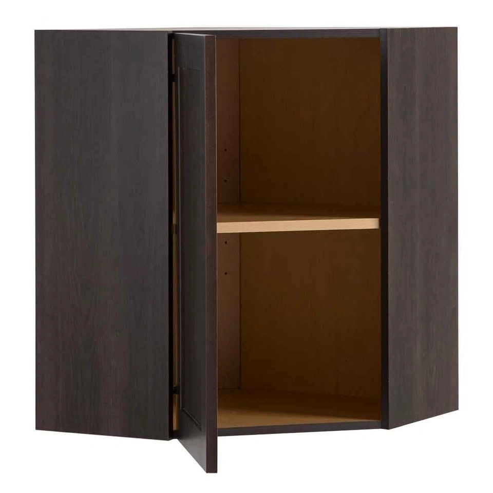 Hampton Bay Designer Series Diagonal Corner wall cabinet adds needed storage, organization and beauty to your kitchen design. Doors have soft-close hinges. The cabinet is preassembled for hassle-free installation.