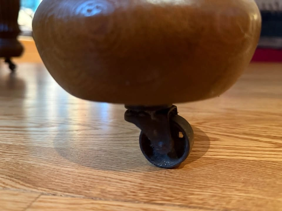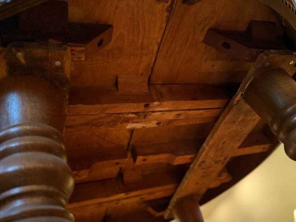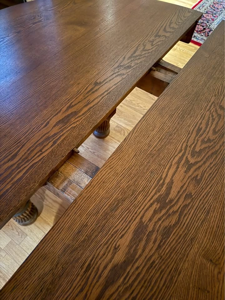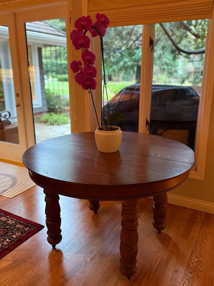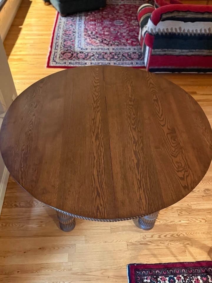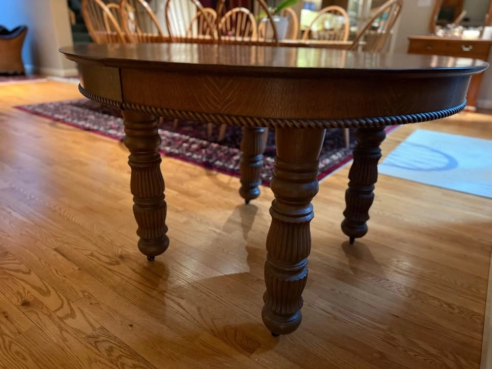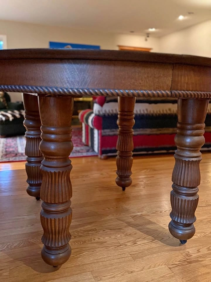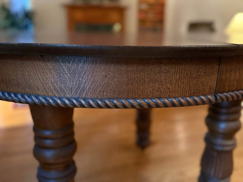 Beautifully restored 1920’s Quarter-Sawn Oak Jacobean Revival Table, extremely sturdy, beautiful patina, and ready for daily use or display. Authentic antique dining table produced by Fond du Lac Table Mfg. (Wisconsin), c. 1920–1935. Crafted in solid quarter-sawn/rift oak with dramatic grain, rope-carved apron, and heavy Jacobean Revival turned legs. Interior joinery and original hardwood wheel casters are intact. Dimensions: 48” round. Original Wheel Casters. Missing the sliding expansion leaves. A fantastic piece for heritage homes, farmhouse interiors, or serious collectors of early 20th-century American furniture. Pick up near crescent park in South Surrey.