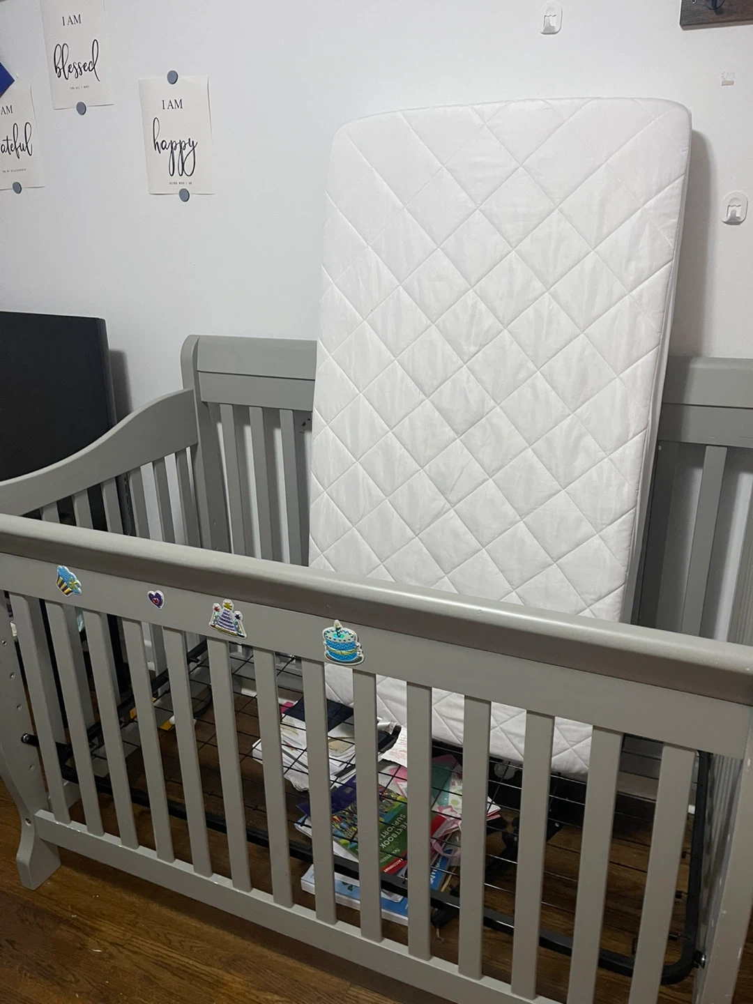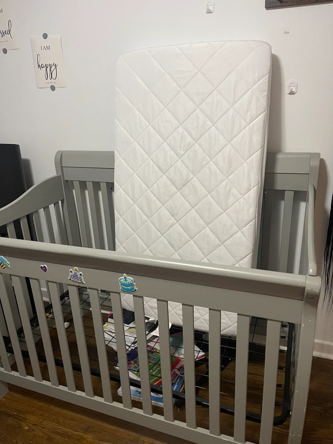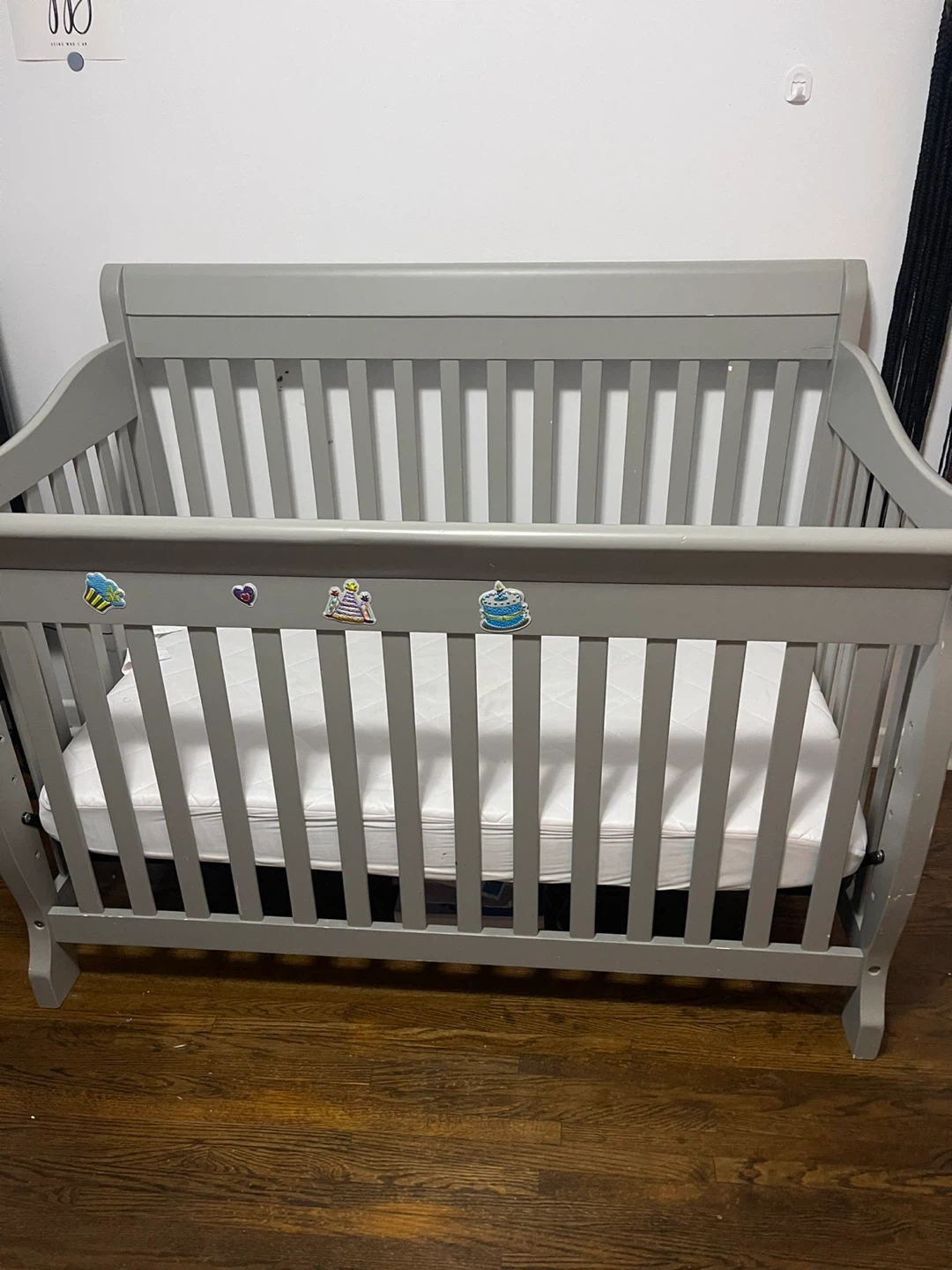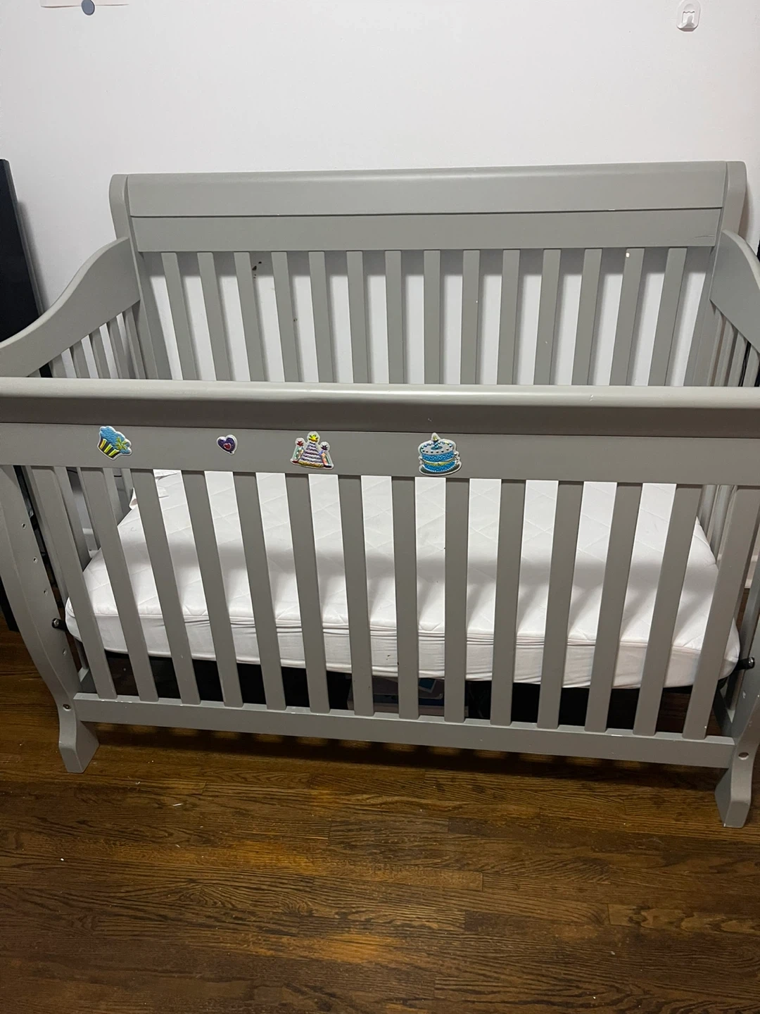 Selling a baby crib in great condition! It comes with a mattress. The crib is a neutral grey colour, perfect for any nursery. There are some cute stickers on one side, but they can be easily removed if you prefer a cleaner look. Ready for a new little one! Good for 0-5yrs