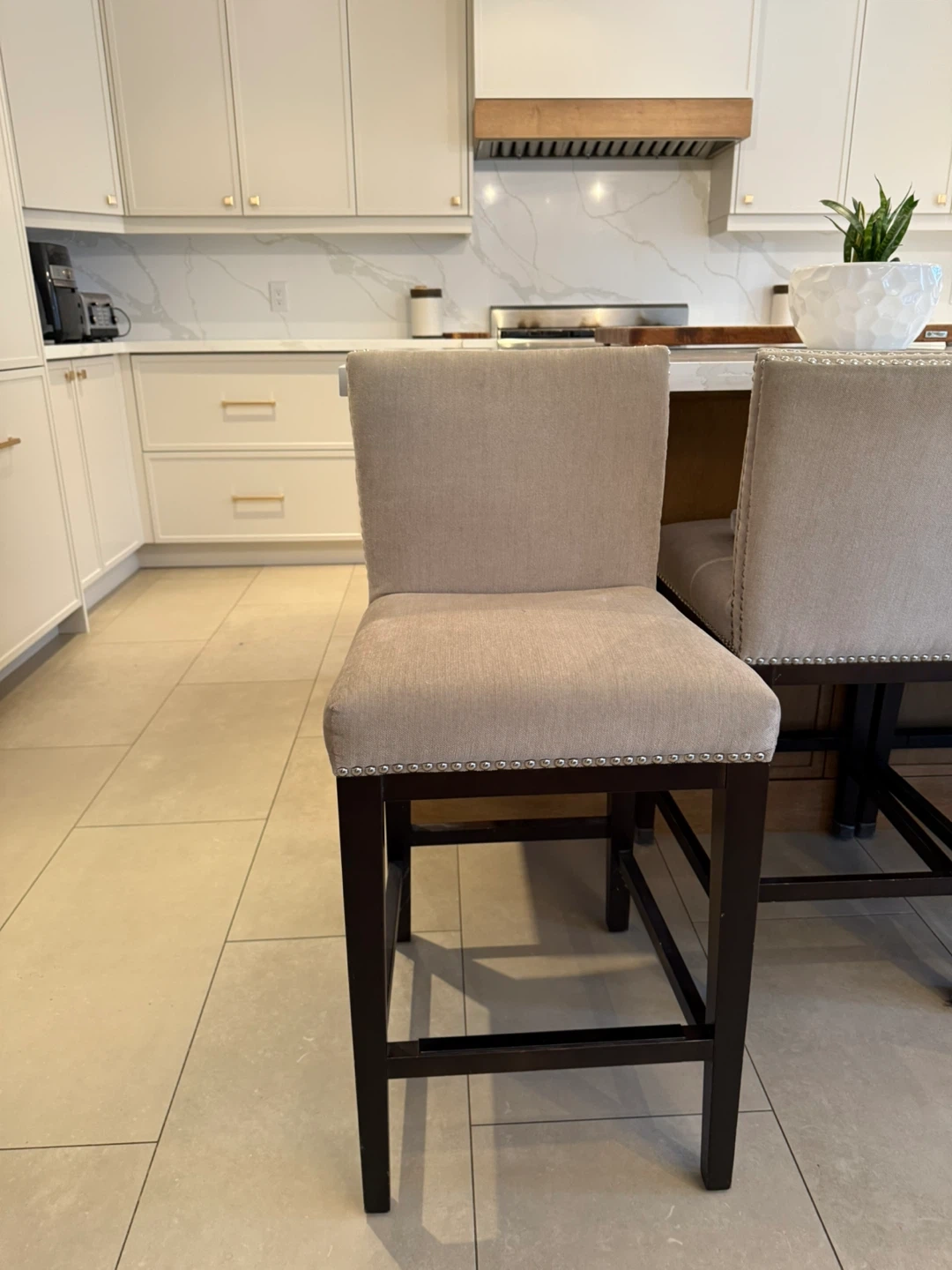 Selling a set of four counter height stools! They're in great shape and would look lovely in any kitchen or bar area. The beige colour is neutral and goes with everything. They have a nailhead trim.