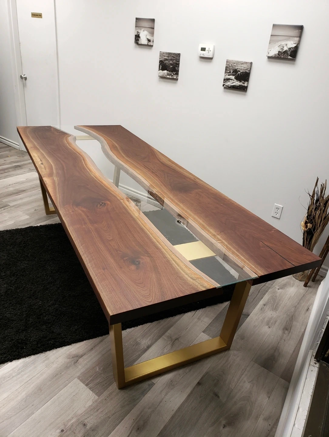 Beautiful live edge river dining table. The table features a wood slab with a clear resin river running through the center and gold legs. It's a unique piece that would look great in any dining room!