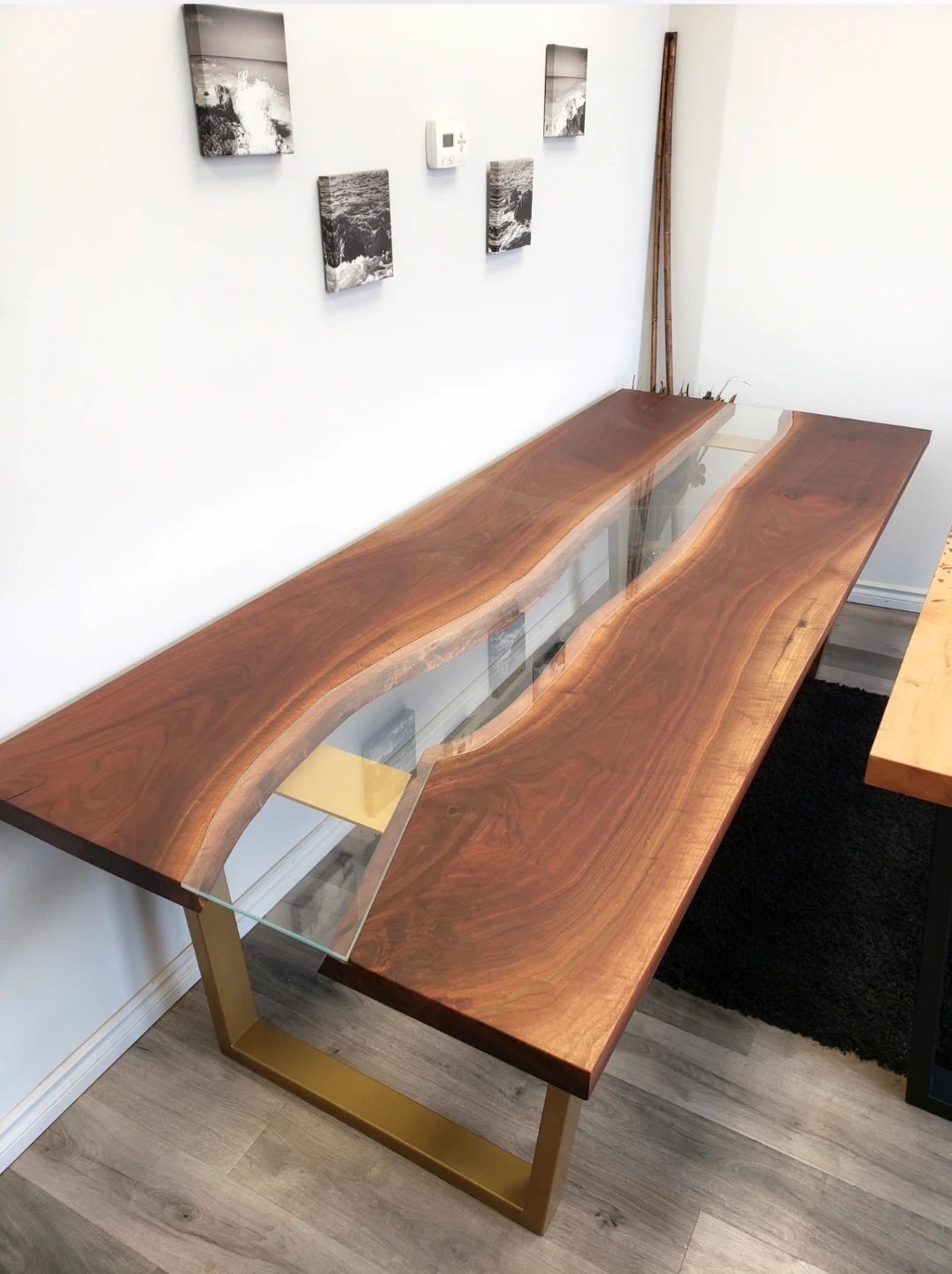 Beautiful live edge river dining table. The table features a wood slab with a clear resin river running through the center and gold legs. It's a unique piece that would look great in any dining room!