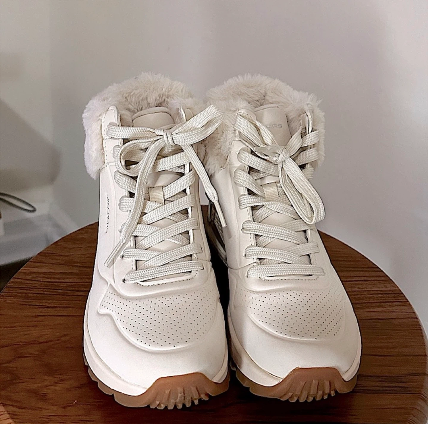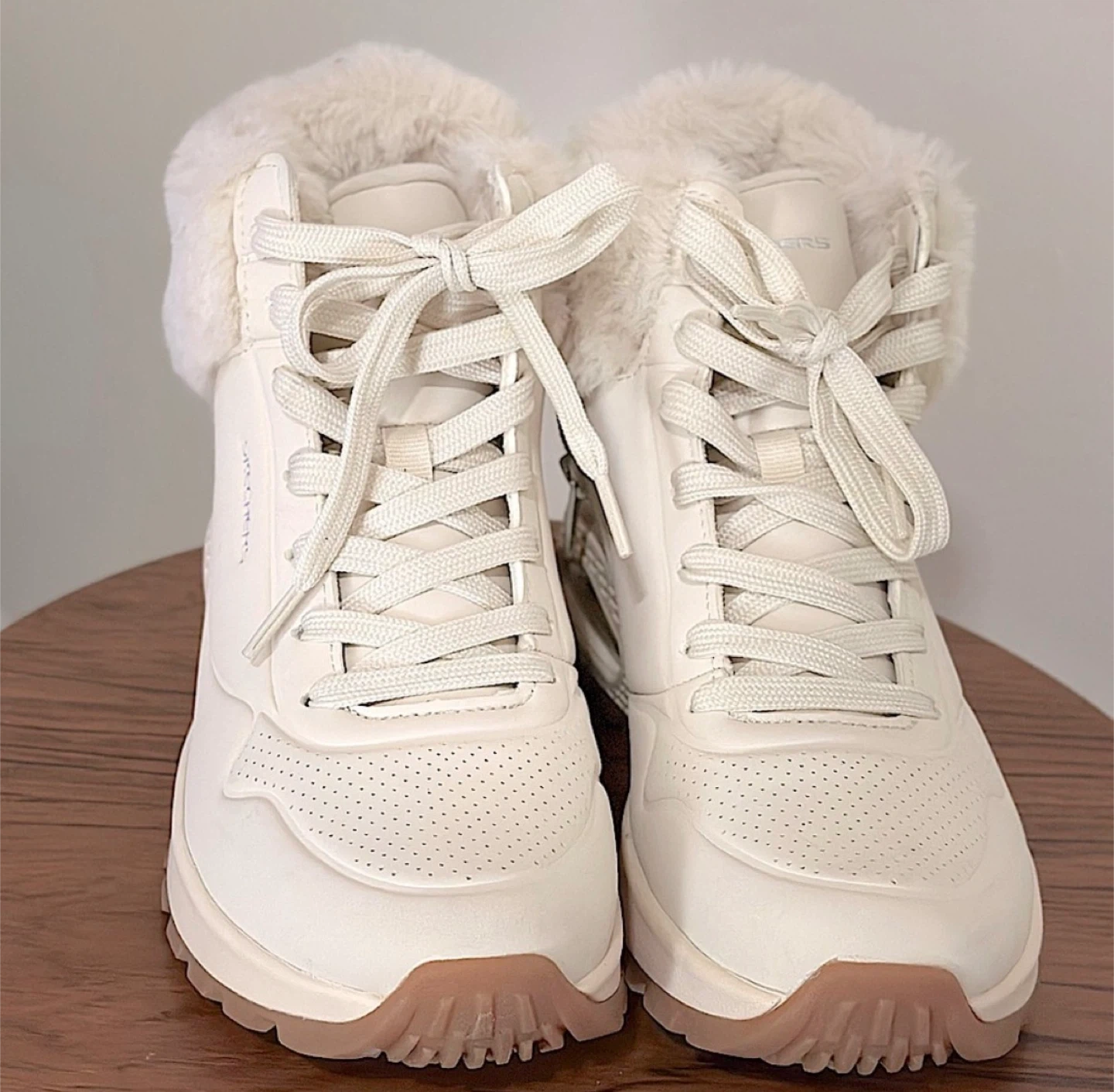 Selling a pair of Skechers Women's Snow Burst boots in size 6. They're a stylish and comfortable option for colder weather. The boots feature a cozy faux-fur trim and a lace-up design. Perfect for adding a touch of warmth and style to your winter outfits!