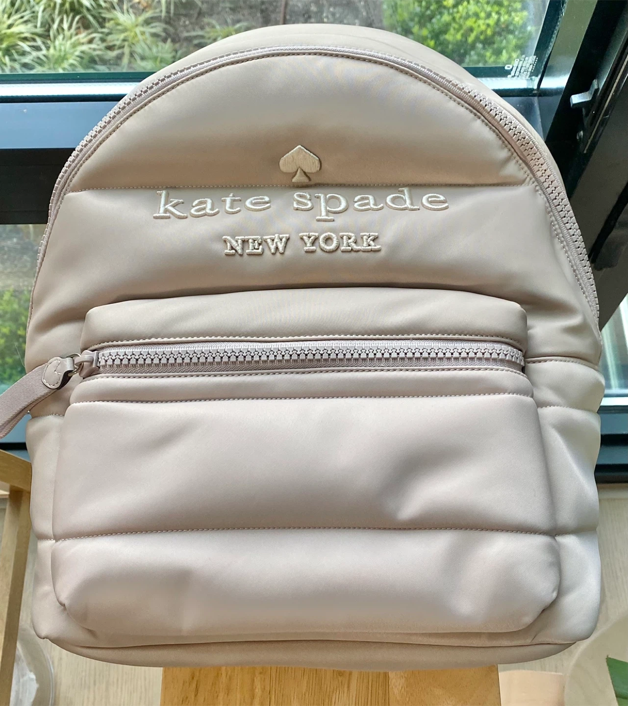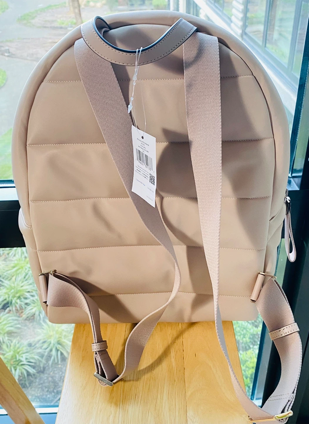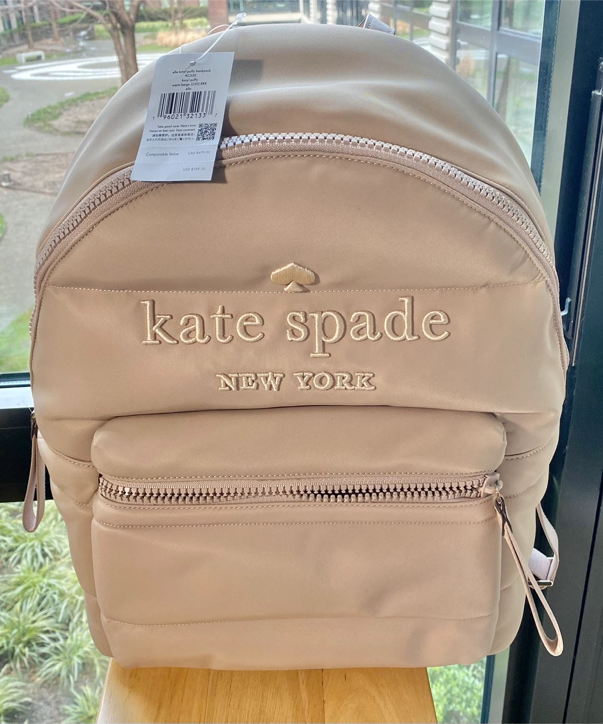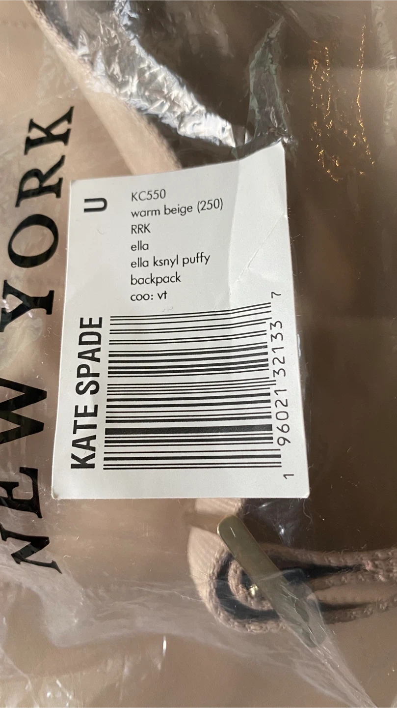 Selling a Kate Spade Ella ksny puffy backpack in a beautiful warm beige color. The tag shows a comparable value of CAD $479.00 and USD $399.00. Brand new and ready for its next adventure!