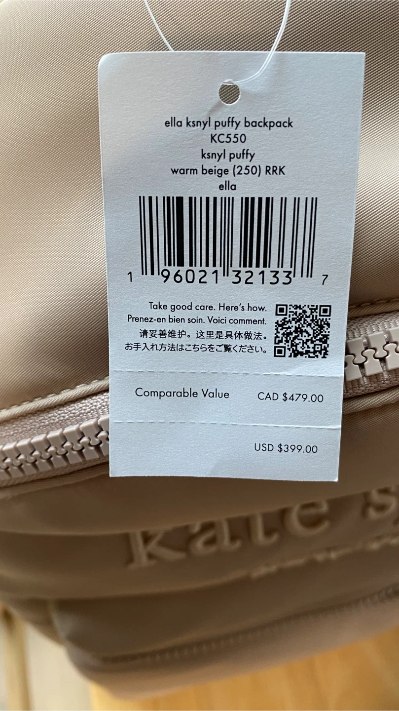 Selling a Kate Spade Ella ksny puffy backpack in a beautiful warm beige color. The tag shows a comparable value of CAD $479.00 and USD $399.00. Brand new and ready for its next adventure!