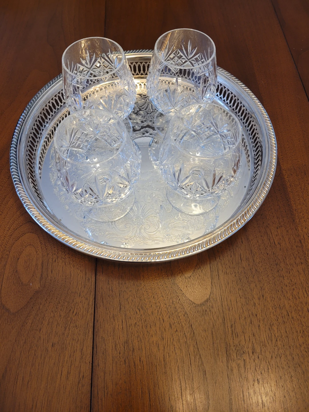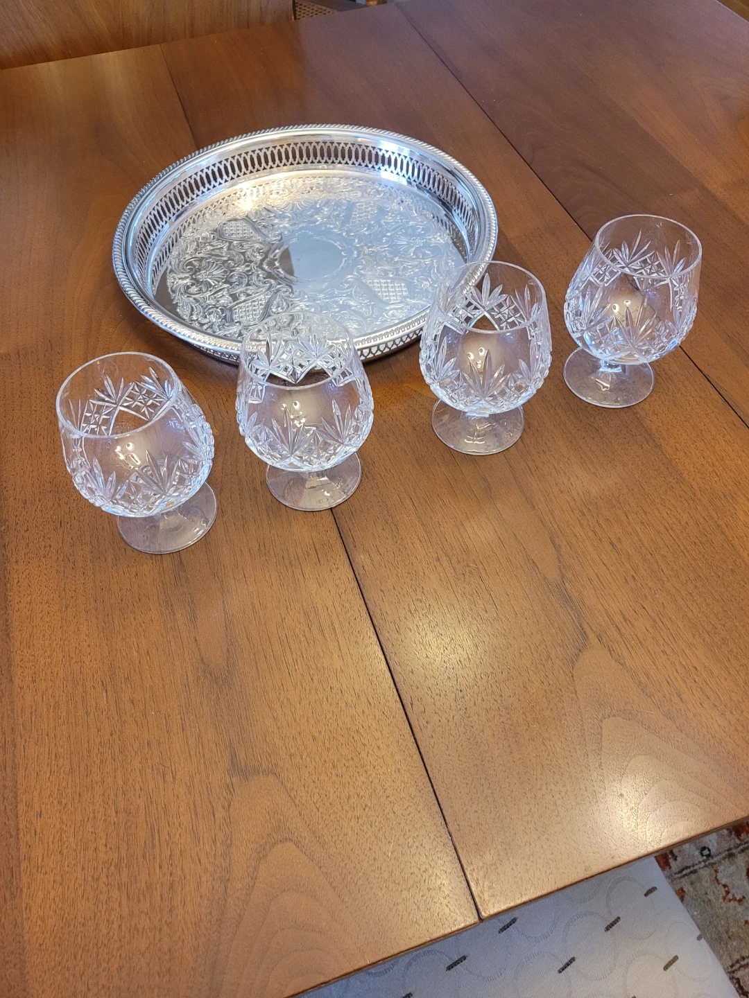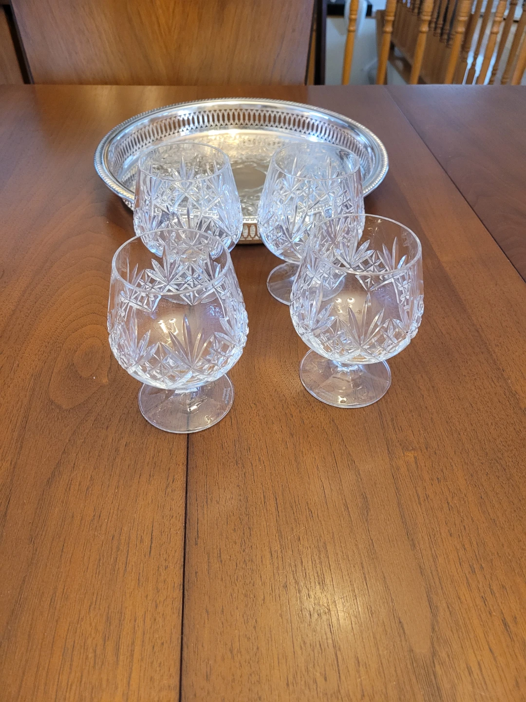 Selling a set of four elegant crystal glasses from Edinburgh International. These snifter glasses feature a beautiful intricate design and are in great condition! Perfect for adding a touch of sophistication to your home bar or dining table! Add a bottle, makes a nice housewarming gift. Included this Silver Plate tray.