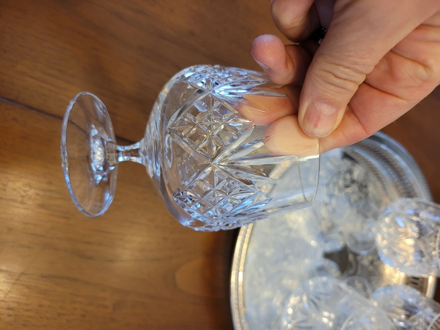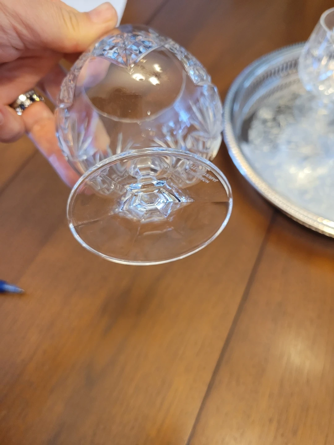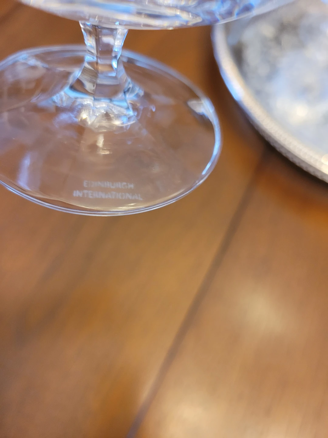Selling a set of four elegant crystal glasses from Edinburgh International. These snifter glasses feature a beautiful intricate design and are in great condition! Perfect for adding a touch of sophistication to your home bar or dining table! Add a bottle, makes a nice housewarming gift. Included this Silver Plate tray.