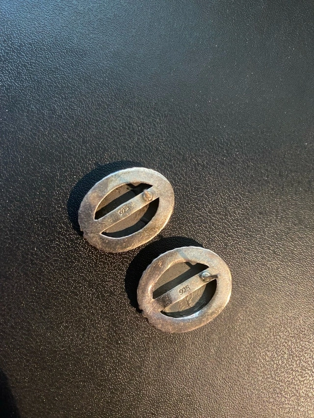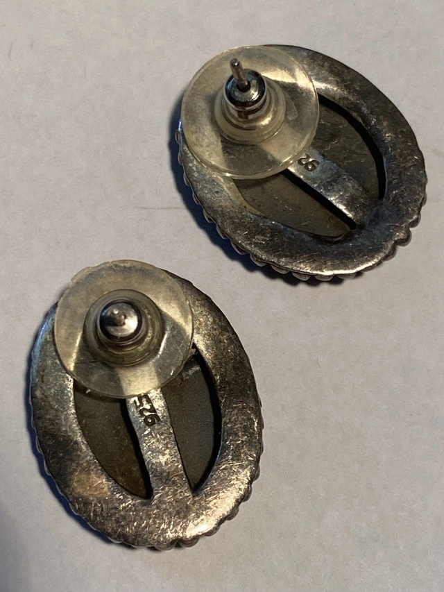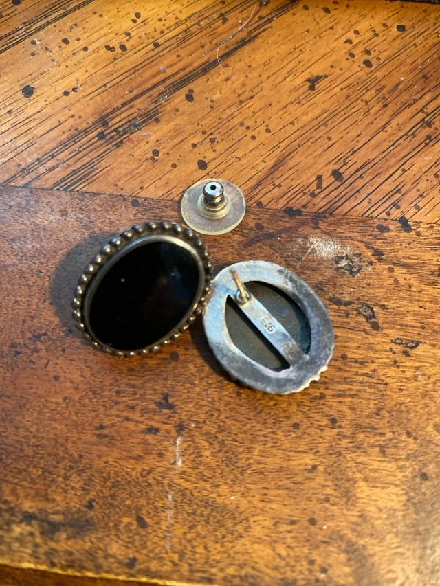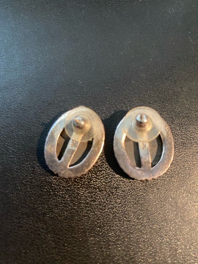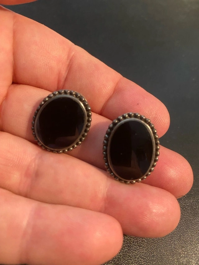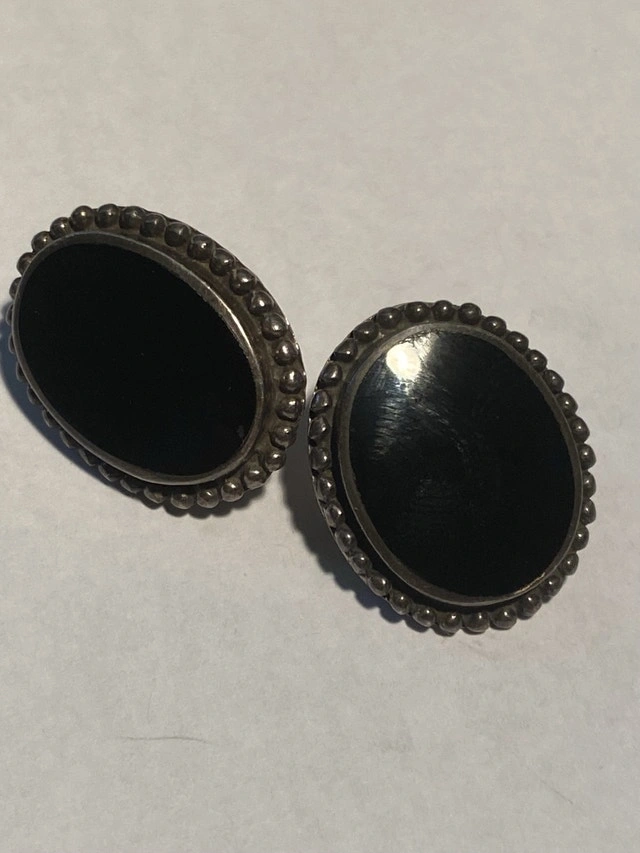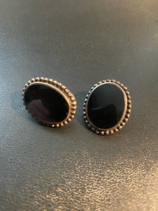 These are used sterling silver earrings with a black stone. The back of the earrings are stamped 925 indicating sterling silver. They are in good condition, but are missing the original packaging.