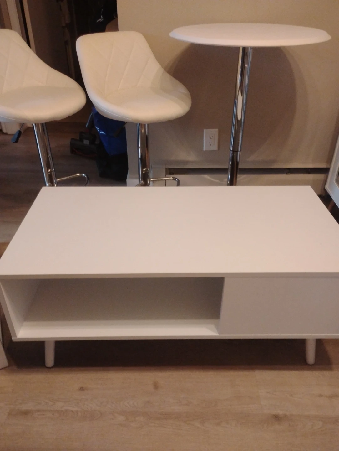 Selling a white coffee table and storage cabinet table and chairs and boot bench. They're in great condition and would be perfect for any living room or dining area. They can be sold together or separately 500 for all, or make offers for pieces