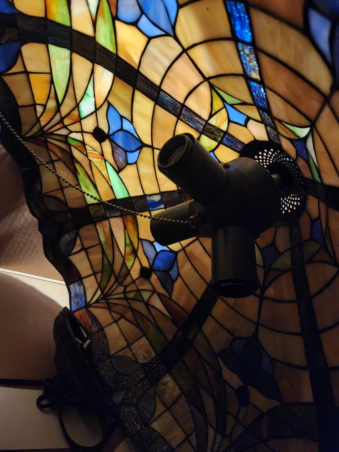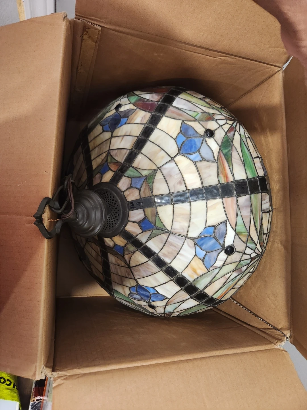 Selling a beautiful stained glass hanging lamp! The intricate design features a mix of blues, greens, and yellows, creating a warm and inviting glow. Perfect for adding a touch of elegance to any room