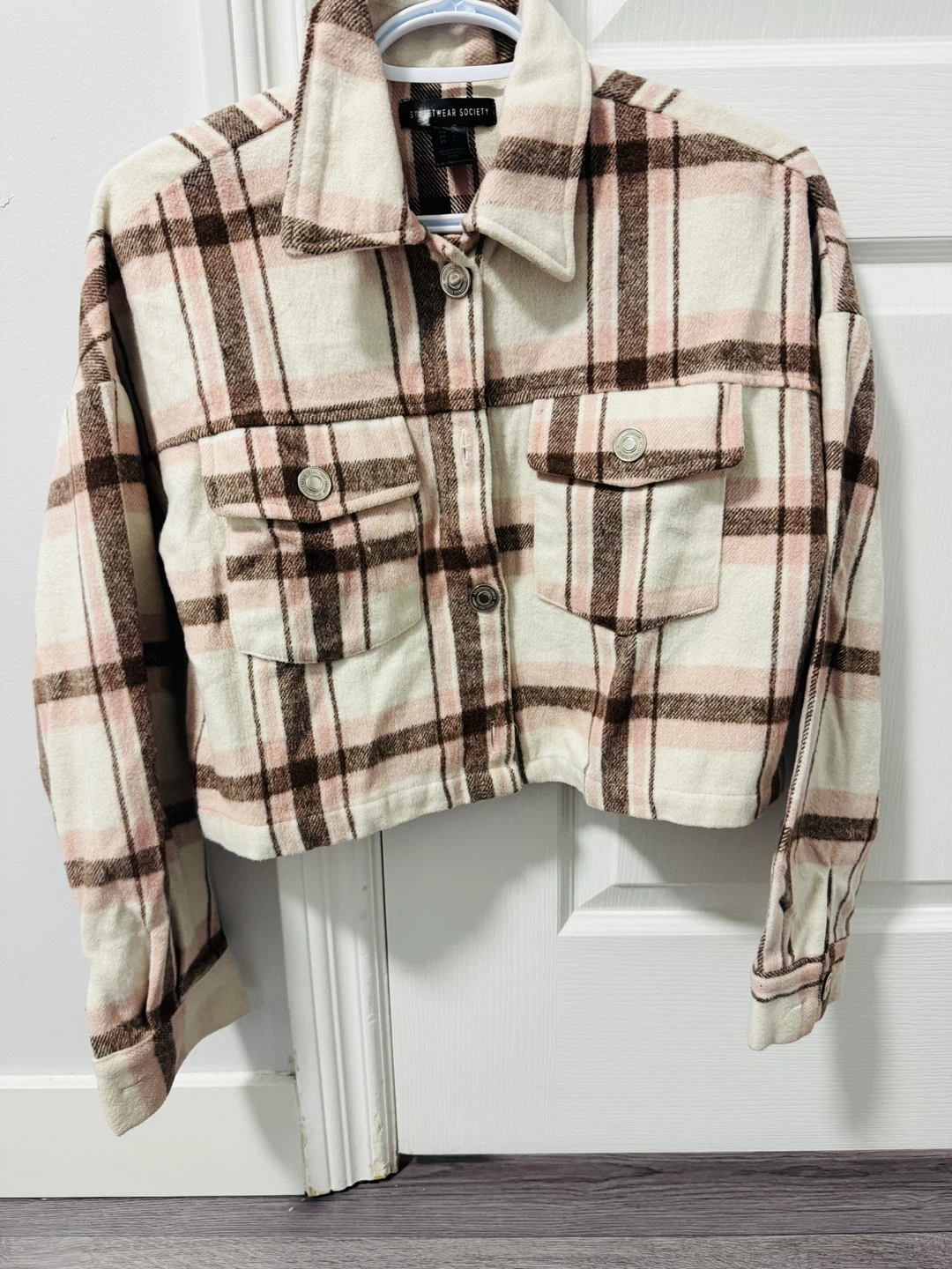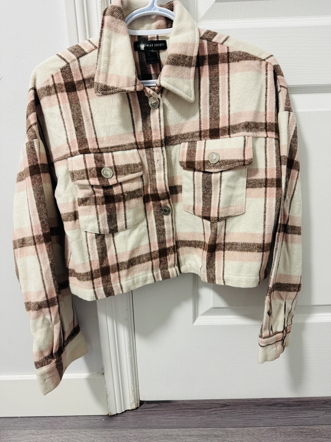 Here's a cute plaid crop jacket from Westwear Society. It's in great condition and features a classic plaid pattern. Perfect for adding a touch of style to any outfit!