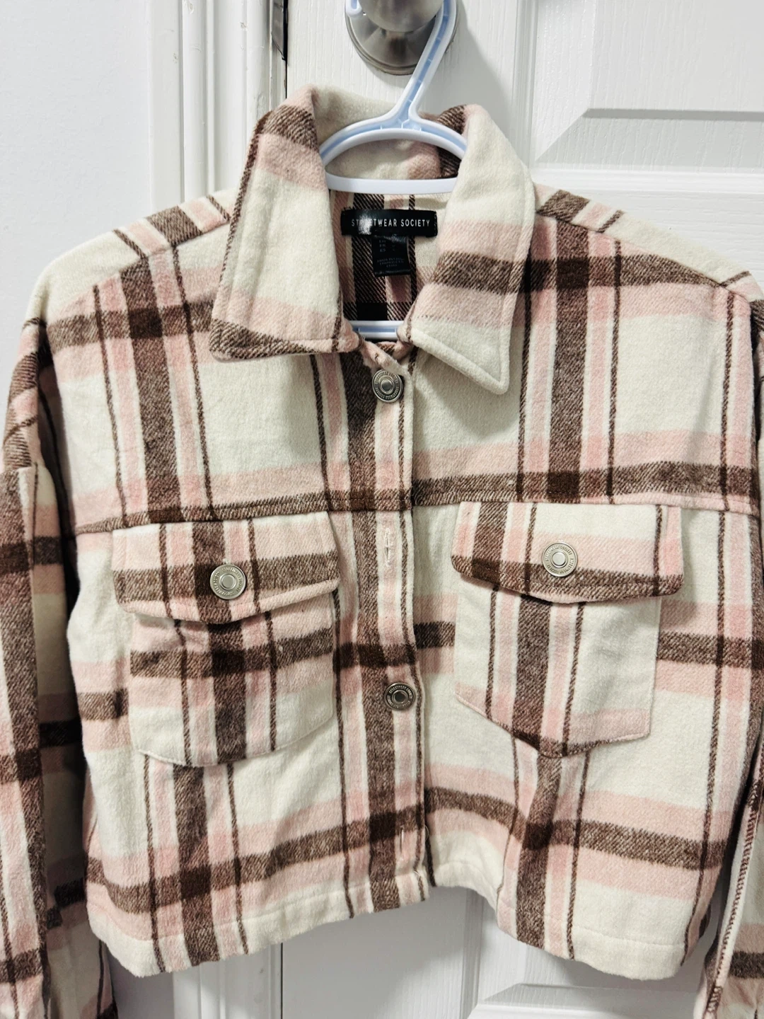 Here's a cute plaid crop jacket from Westwear Society. It's in great condition and features a classic plaid pattern. Perfect for adding a touch of style to any outfit!