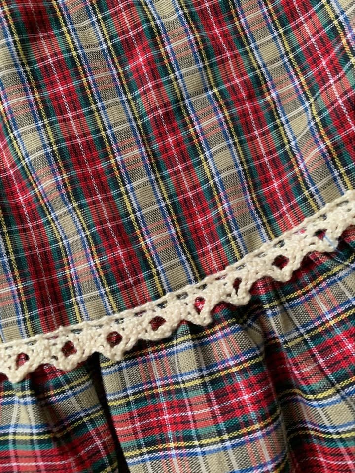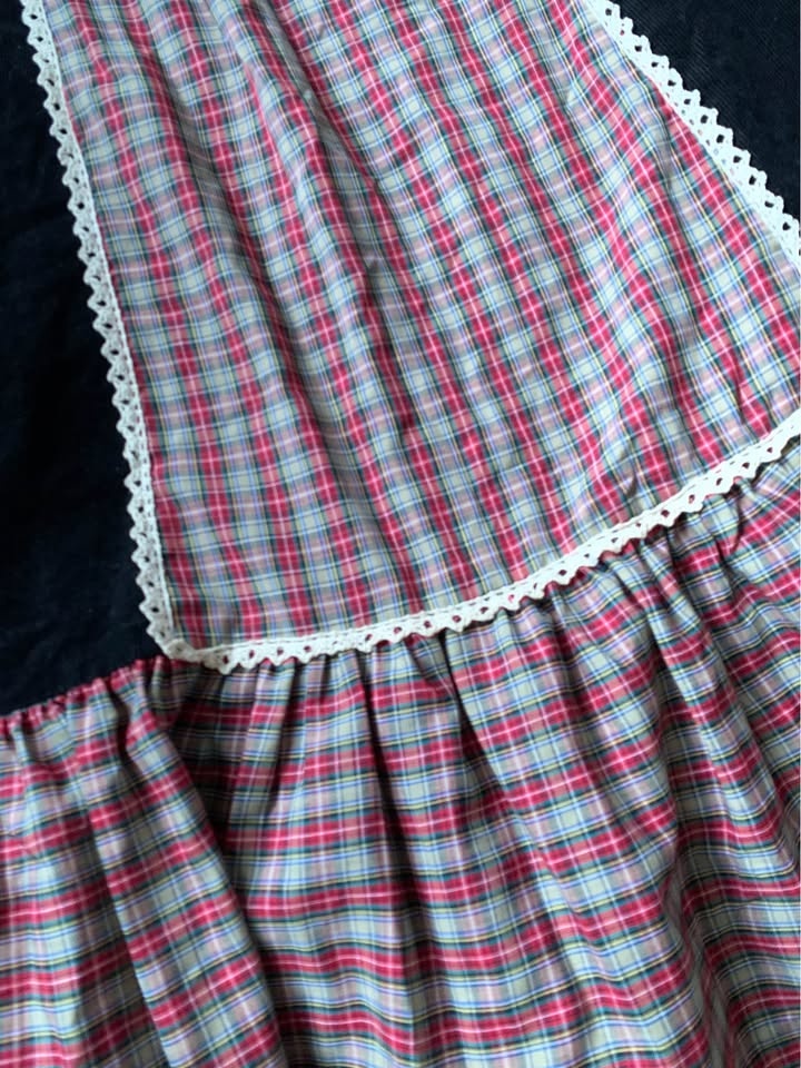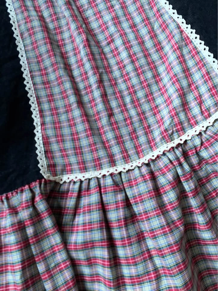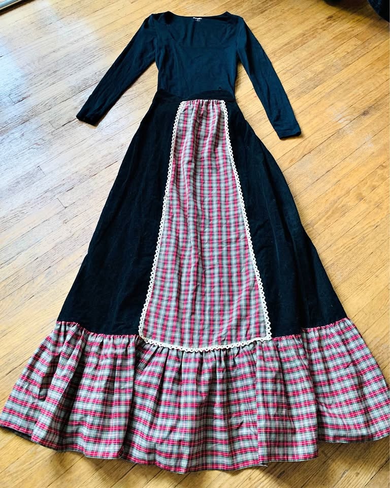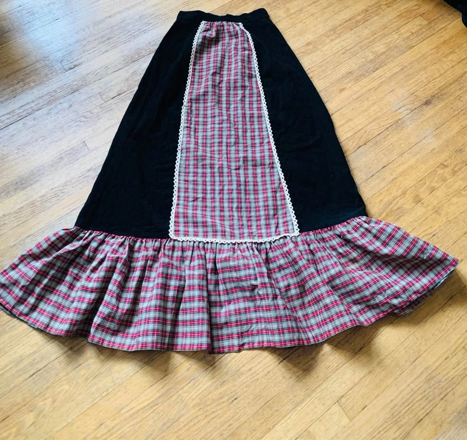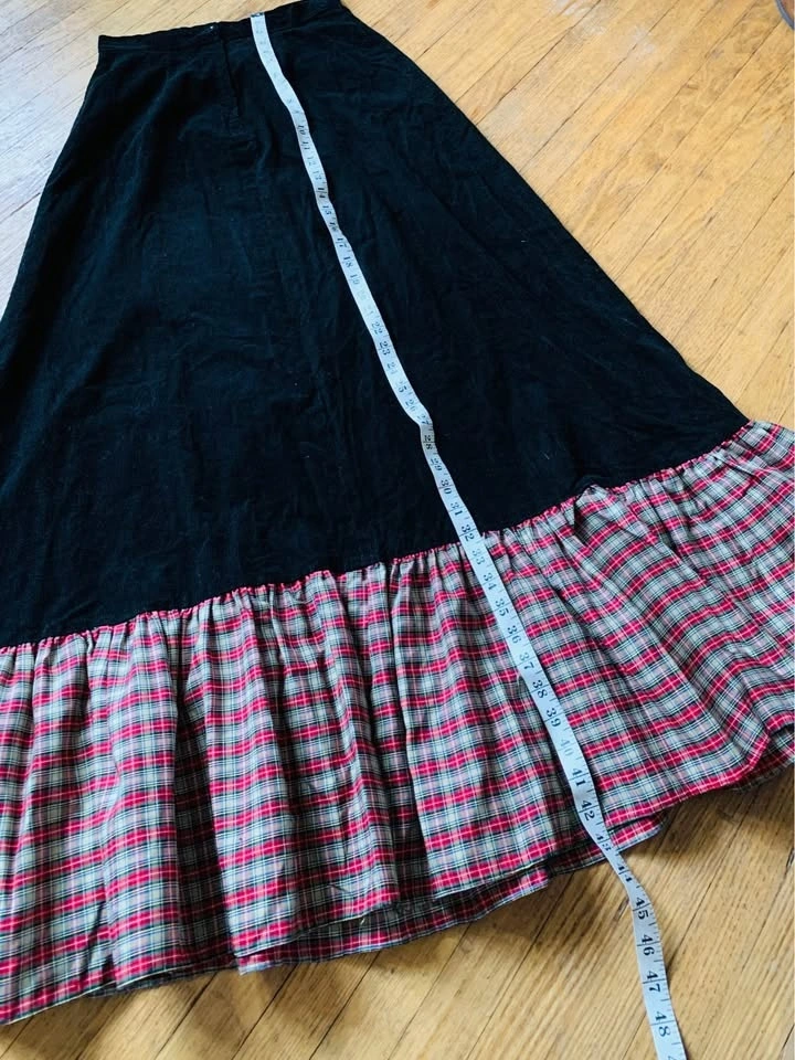 Gorgeous, long Vintage maxi skirt made of pure cotton, black corduroy and pure cotton plaid with cotton lace trim around the plaid in the front. It is a stunning skirt. This post is only for the skirt, although it’s shown in some photographs with a black bodysuit/top. It’s an amazing skirt. The length is 43 inches. The waist is 27” The full span of the skirt is 48 inches across at the very bottom. On the back is a approximately 7 inch hidden zipper mid back with a button.