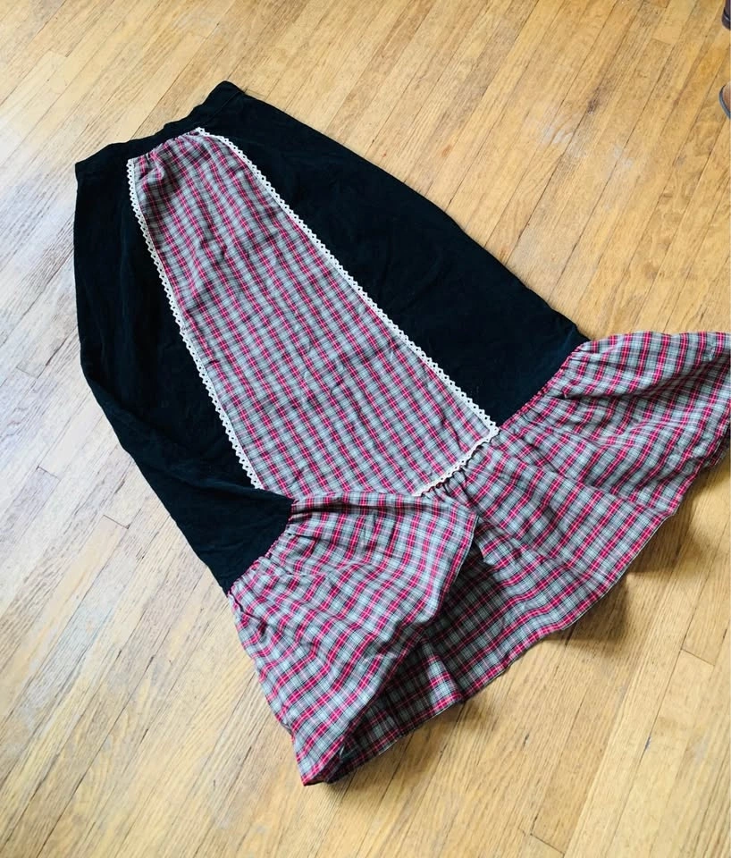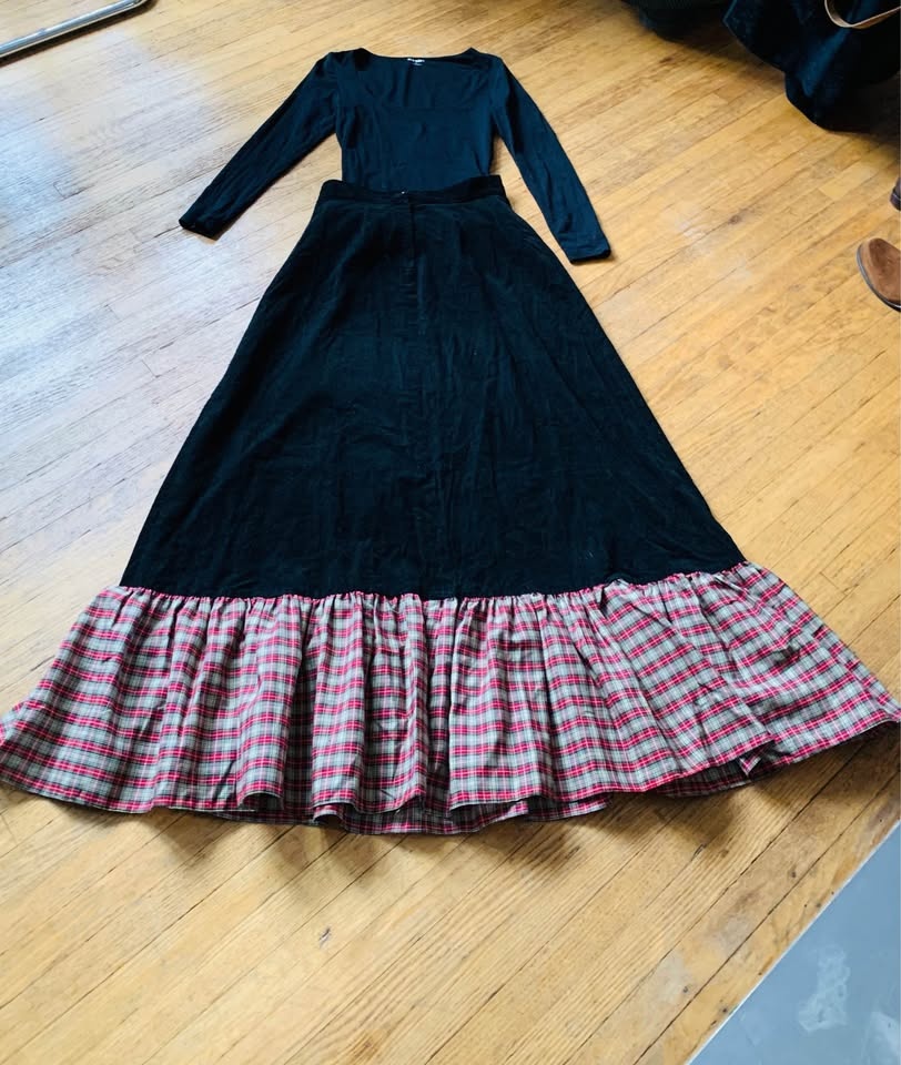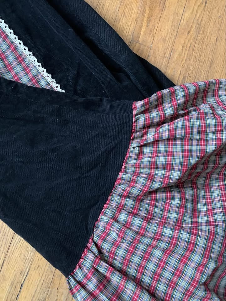 Amazing Vintage Maxi Skirt, Black Cordouroy and Cotton Plaid. Pe