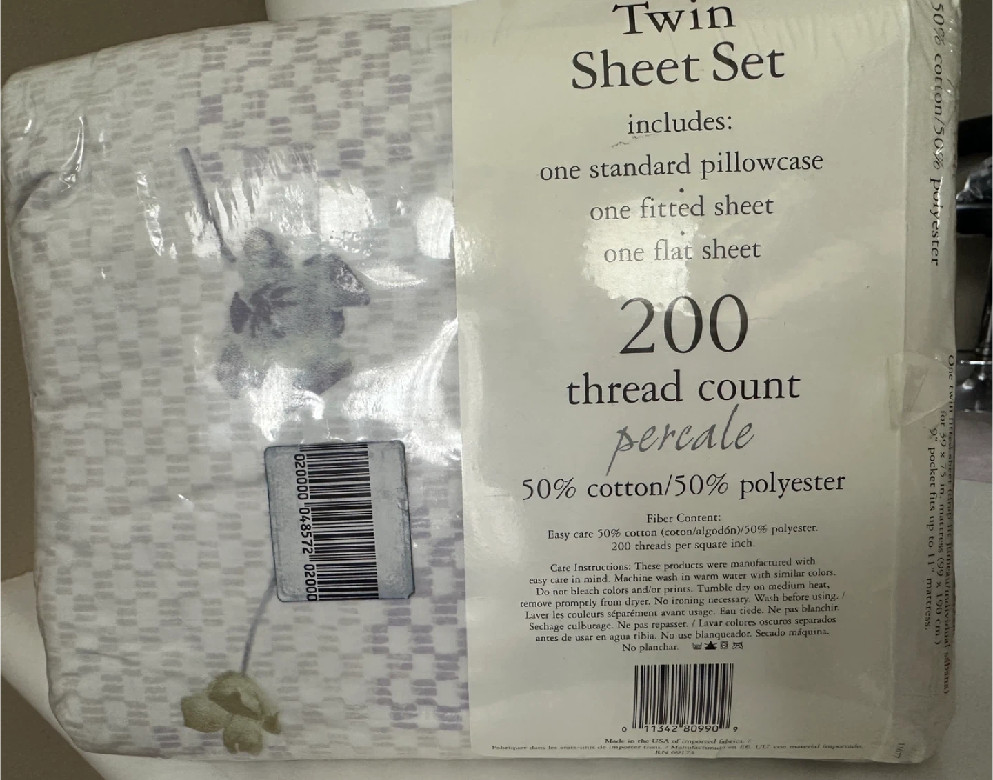 Selling a brand new twin sheet set, still in its original packaging! The set includes one standard pillowcase, one fitted sheet, and one flat sheet. It features a 200 thread count percale and is made of 50% cotton and 50% polyester. The fitted sheet fits up to an 11" mattress