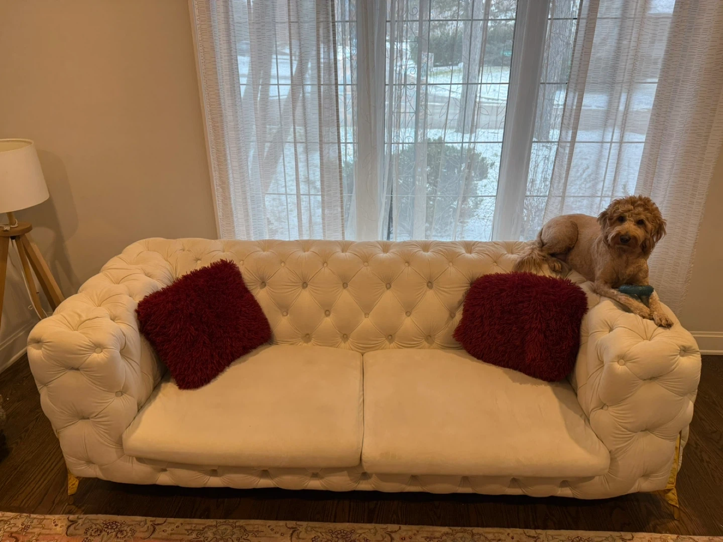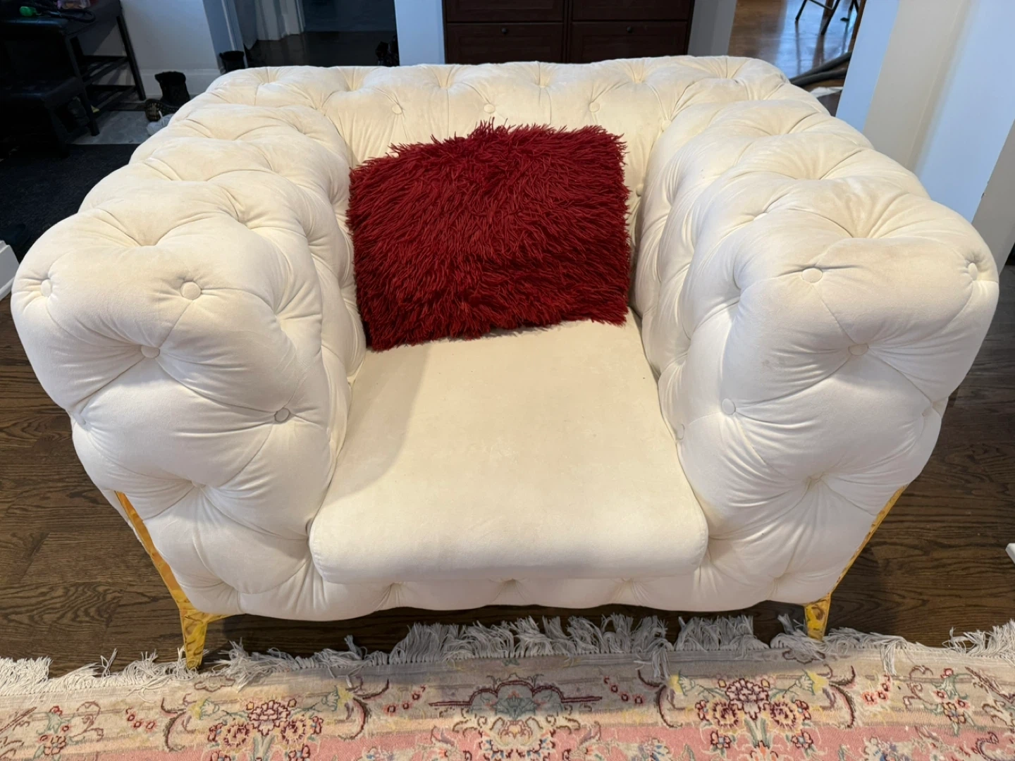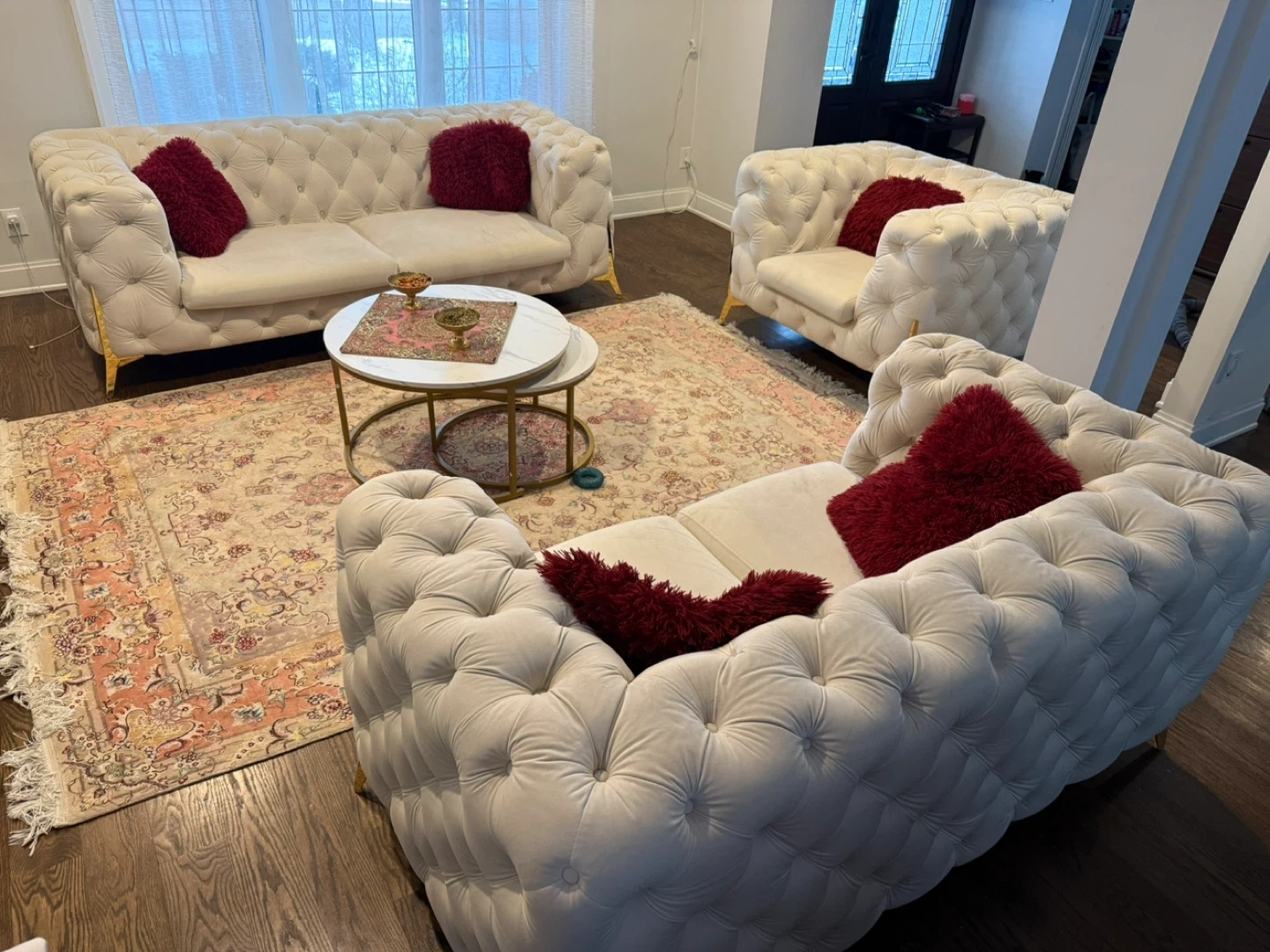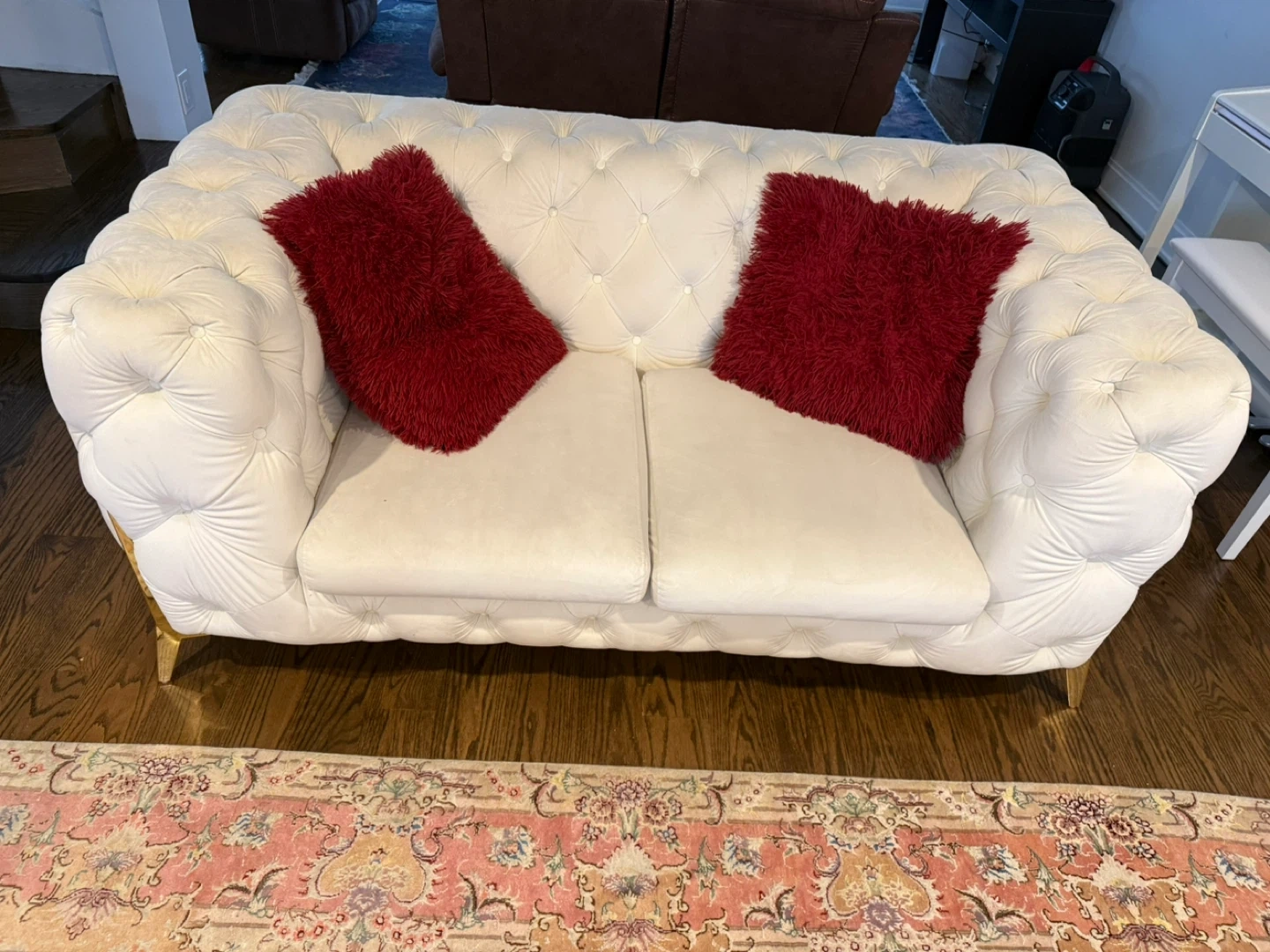 Selling a beautiful white tufted sofa and loveseat set. It's in great condition and would look lovely in any living room