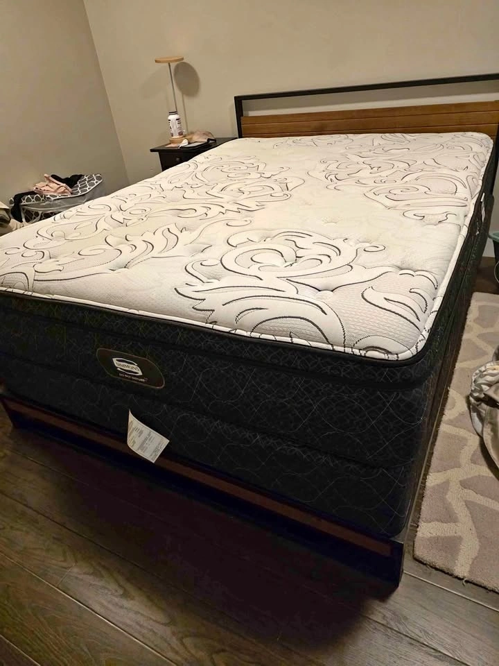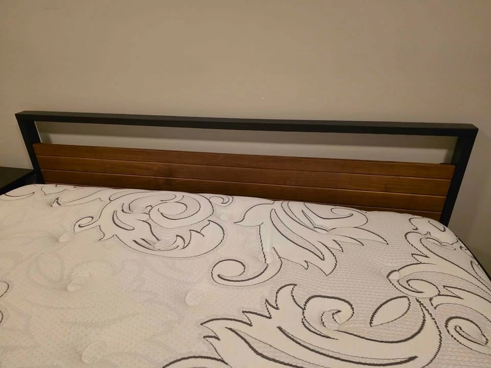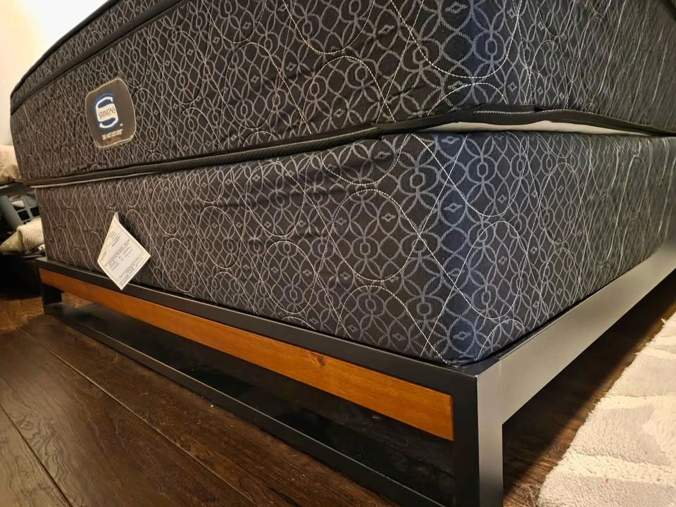 Low profile contemporary queen sized bed frame with box spring and mattress.