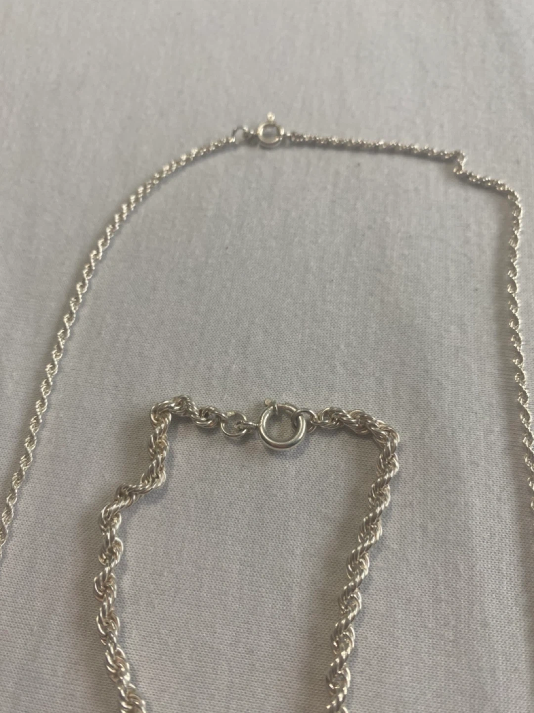 Selling a matching silver rope chain necklace and bracelet set. They're in great condition and would make a lovely addition to any jewelry collection