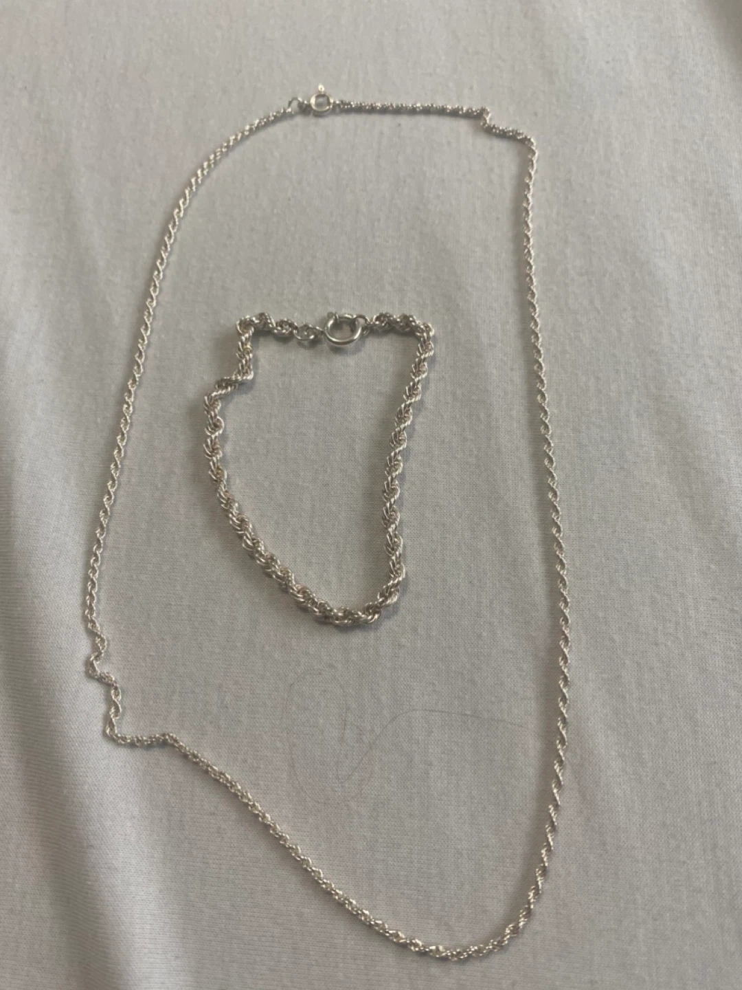 Selling a matching silver rope chain necklace and bracelet set. They're in great condition and would make a lovely addition to any jewelry collection