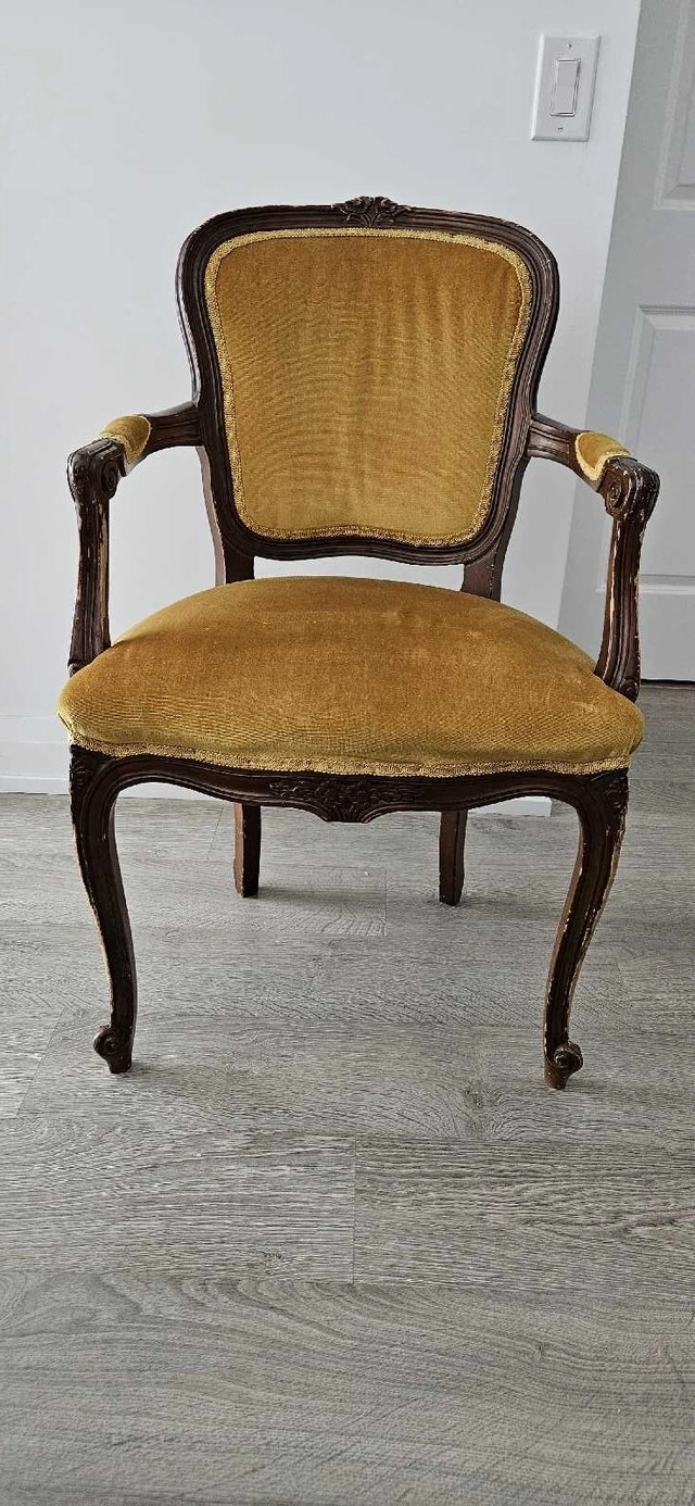 This is a beautiful accent chair with an antique style. It features a mustard yellow velvet upholstery and dark wood frame. Perfect for adding a touch of vintage charm to any room! Has some faded wood color. I have 2 chairs for $150. If buying one chair, $100. Pick up only.