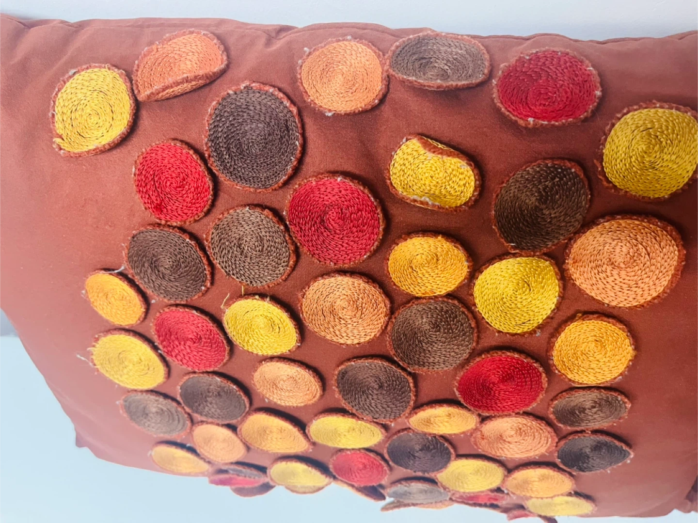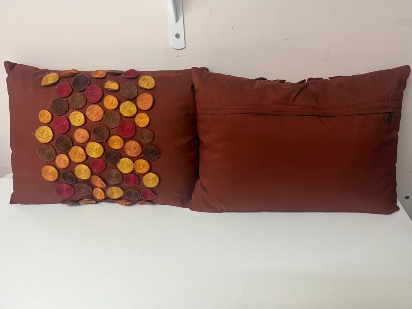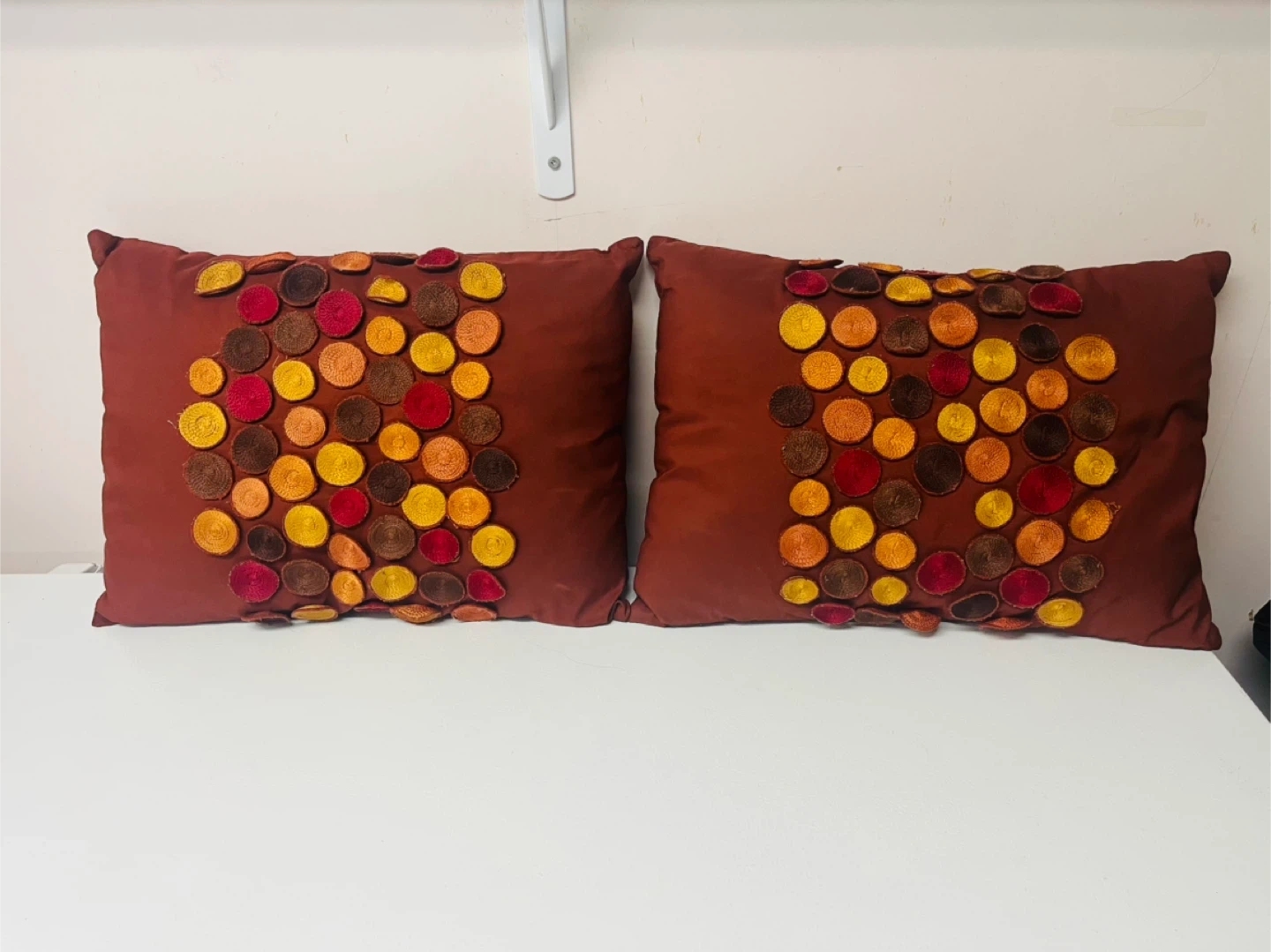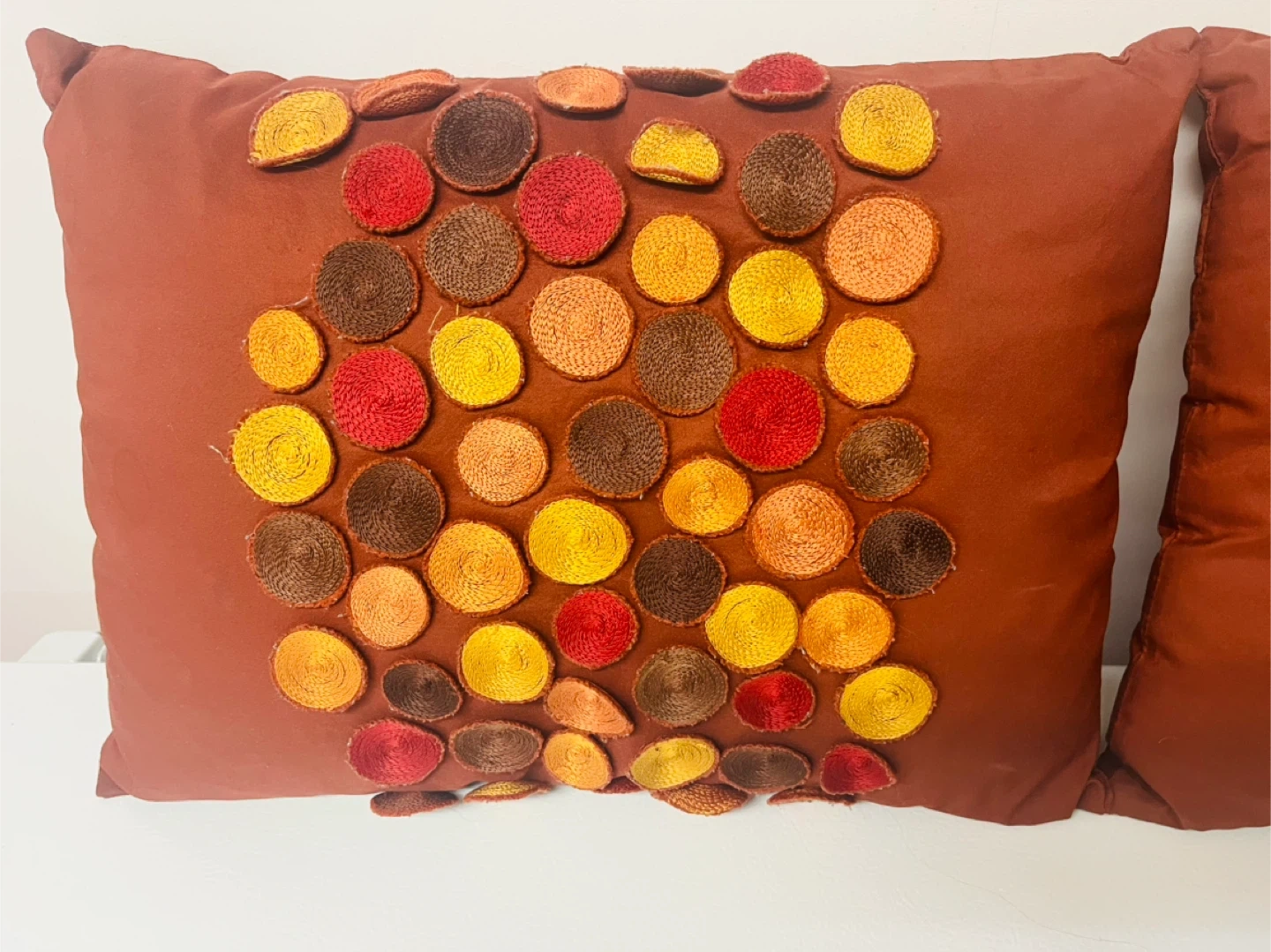 Here's a set of decorative pillows from Pier 1! They feature a unique circular design with various colours. They're in great condition and would be a lovely addition to any living space. 20 for the set