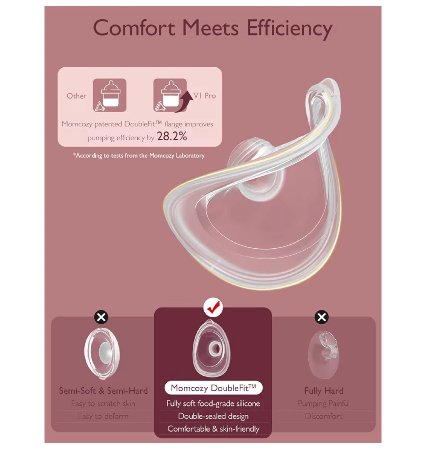 The double-electric hands-free breast pump empowers moms to multitask, weighing just 118g per cup and holding 180ml of breast milk each. The DoubleFit Flange endorsed by Momcozy's user testing research, ensures a superior fit for the breast and has the potential to increase milk production by 28.2%.