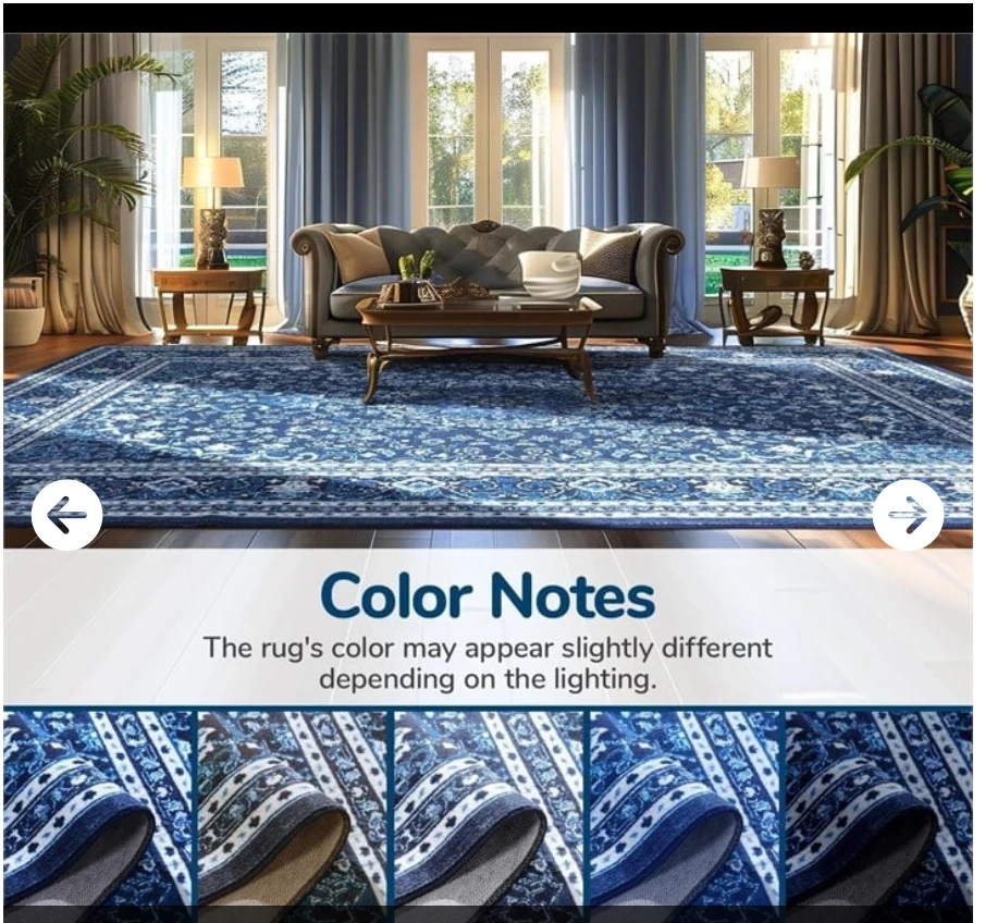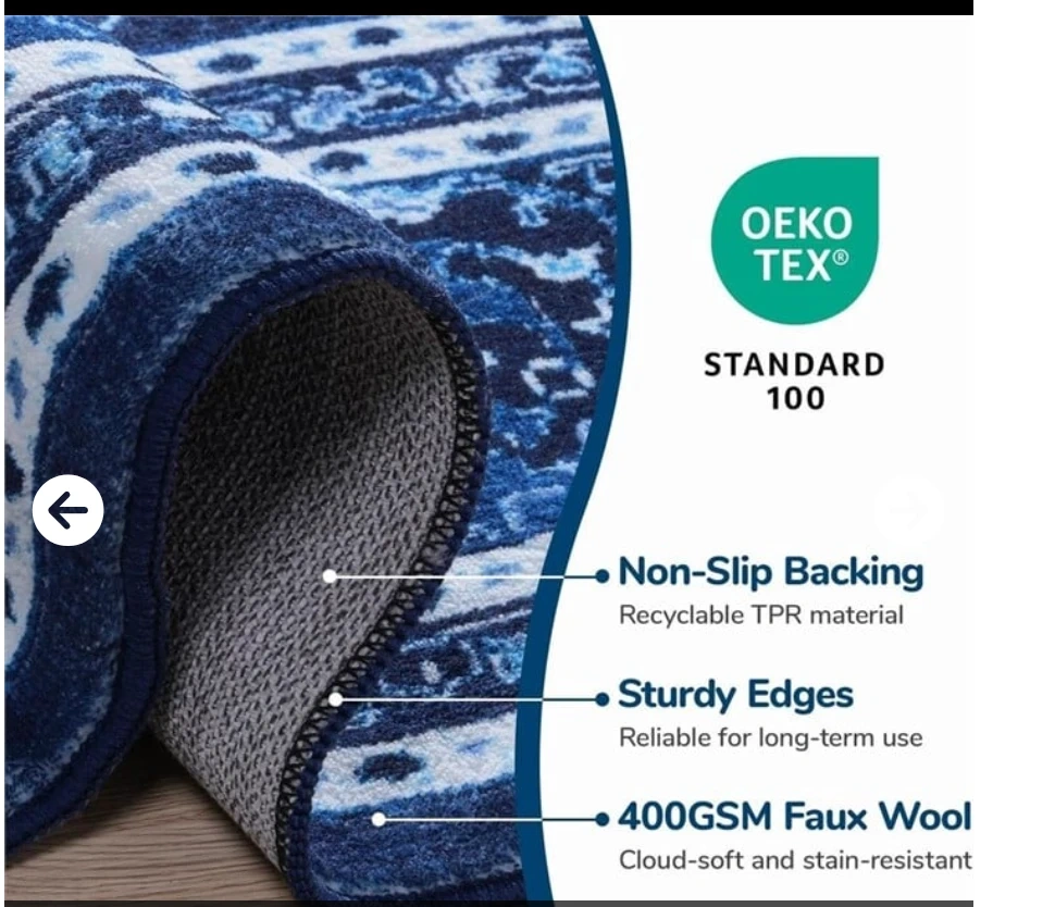 Washable Area Rugs 6x9, Boho Area Rug Low Pile for Bedroom Living Room Kitchen, Ultra-Soft Faux Wool Vintage Area Rug with Non-Slip Rubber, Kid & Pet Friendly, Blue White